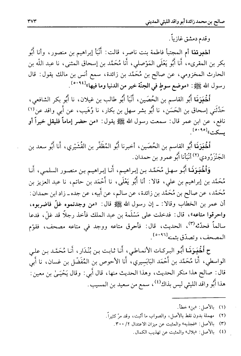 وقدم دمشق غازيا أخبرتنا أم المجتبأ فاطمة بنت ناصر قالت أنبأ إبراهيم بن منصور وأنا أبو بكر بن المقرئ أنا أبو يعلى الموصلي أنا محمد بن إسحاق المثنى نا عبد الله بن الحارث المخزومي عن صالح بن محمد بن زائدة سمع أنس بن مالك يقول قال رسول الله (صلى الله عليه وسلم) موضع سوط في الجنة خير من الدنيا وما فيها أخبرنا أبو القاسم بن الحصين أنبأ أبو طالب بن غيلان نا أبو بكر الشافعي حدثني إسحاق بن الحسن نا أبو بشر سهل بن بكار نا وهيب عن أبي واقد عن (1) نافع عن ابن عمر قال سمعت رسول الله (صلى الله عليه وسلم) يقول من حضر إماما فليقل خيرا أو يسكت أخبرنا أبو القاسم بن الحصين أخبرنا أبو المظفر بن القشيري أنا أبو سعد بن الجنزرودي (2) أنبأنا أبو عمرو بن حمدان وأخبرنا أبو سهل محمد بن إبراهيم أنا إبراهيم بن منصور السلمي أنا محمد بن إبراهيم بن علي قالا أنا أبو يعلى نا أحمد بن حاتم نا عبد العزيز بن محمد عن صالح بن محمد بن زائدة عن سالم عن أبيه عن جده زاد ابن حمدان أن عمر بن الخطاب وقالا إن رسول الله (صلى الله عليه وسلم) قال من وجدتموه غل فاضربوه واحرقوا متاعه قال فدخلت على مسلمة بن عبد الملك فأخذ رجلا قد غل فدعا سالما فحدثه (3) الحديث قال فأحرق متاعه ووجد في متاعه مصحف فقوم المصحف وتصدق بثمنه ح أخبرنا أبو البركات الأنماطي أنا ثابت بن بندار أنا محمد بن علي الواسطي أنا محمد بن أحمد البابسيري أنا الأحوص بن المفضل بن غسان نا أبي قال صالح هذا منكر الحديث وهذا الحديث منها قال أبي وقال يحيى بن معين هذا أبو واقد الليثي ليس بذاك (4) سمع من سعيد بن المسيب