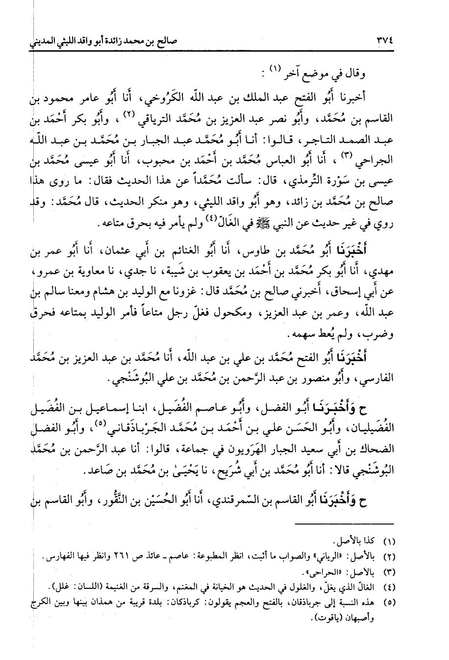 وقال في موضع آخر (1) أخبرنا أبو الفتح عبد الملك بن عبد الله الكروخي أنا أبو عامر محمود بن القاسم بن محمد وأبو نصر عبد العزيز بن محمد الترياقي (2) وأبو بكر أحمد بن عبد الصمد التاجر قالوا أنا أبو محمد عبد الجبار بن محمد بن عبد الله الجراحي (3) أنا أبو العباس محمد بن أحمد بن محبوب أنا أبو عيسى محمد بن عيسى بن سورة الترمذي قال سألت محمدا عن هذا الحديث فقال ما روى هذا صالح بن محمد بن زائد وهو أبو واقد الليثي وهو منكر الحديث قال محمد وقد روي في غير حديث عن النبي (صلى الله عليه وسلم) في الغال (4) ولم يأمر فيه بحرق متاعه أخبرنا أبو محمد بن طاوس أنا أبو الغنائم بن أبي عثمان أنا أبو عمر بن مهدي أنا أبو بكر محمد بن أحمد بن يعقوب بن شيبة نا جدي نا معاوية بن عمرو عن أبي إسحاق أخبرني صالح بن محمد قال غزونا مع الوليد بن هشام ومعنا سالم بن عبد الله وعمر بن عبد العزيز ومكحول فغل رجل متاعا فأمر الوليد بمتاعه فحرق وضرب ولم يعط سهمه أخبرنا أبو الفتح محمد بن علي بن عبد الله أنا محمد بن عبد العزيز بن محمد الفارسي وأبو منصور بن عبد الرحمن بن محمد بن علي البوشنجي ح وأخبرنا أبو الفضل وأبو عاصم الفضيل ابنا إسماعيل بن الفضيل الفضيليان وأبو الحسن علي بن أحمد بن محمد الجرباذقاني (5) وأبو الفضل الضحاك بن أبي سعيد الجبار الهرويون في جماعة قالوا أنا عبد الرحمن بن محمد البوشنجي قالا أنا أبو محمد بن أبي شريح نا يحيى بن محمد بن صاعد ح وأخبرنا أبو القاسم بن السمرقندي أنا أبو الحسين بن النقور وأبو القاسم بن
