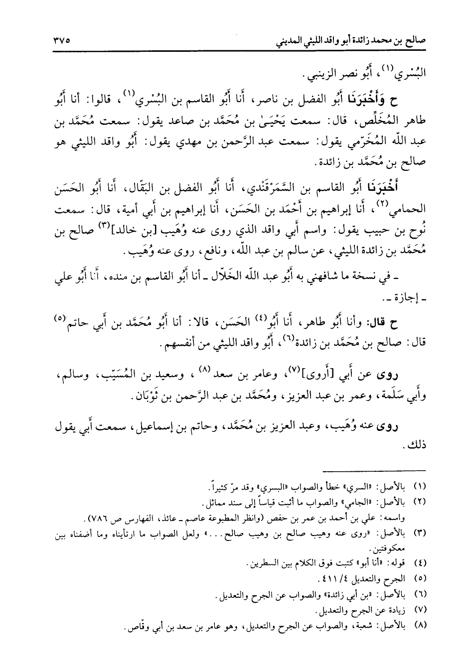 البسري (1) أبو نصر الزينبي ح وأخبرنا أبو الفضل بن ناصر أنا أبو القاسم بن البسري (1) قالوا أنا أبو طاهر المخلص قال سمعت يحيى بن محمد بن صاعد يقول سمعت محمد بن عبد الله المخرمي يقول سمعت عبد الرحمن بن مهدي يقول أبو واقد الليثي هو صالح بن محمد بن زائدة أخبرنا أبو القاسم بن السمرقندي أنا أبو الفضل بن البقال أنا أبو الحسن الحمامي (2) أنا إبراهيم بن أحمد بن الحسن أنا إبراهيم بن أبي أمية قال سمعت نوح بن حبيب يقول واسم أبي واقد الذي روى عنه وهيب بن خالد (3) صالح بن محمد بن زائدة الليثي عن سالم بن عبد الله ونافع روى عنه وهيب في نسخة ما شافهني به أبو عبد الله الخلال أنا أبو القاسم بن منده أنا أبو علي إجازة ح قال وأنا أبو طاهر أنا أبو (4) الحسن قالا أنا أبو محمد بن أبي حاتم (5) قال صالح بن محمد بن زائدة (6) أبو واقد الليثي من أنفسهم روى عن أبي أروى (7) وعامر بن سعد (8) وسعيد بن المسيب وسالم وأبي سلمة وعمر بن عبد العزيز ومحمد بن عبد الرحمن بن ثوبان روى عنه وهيب وعبد العزيز بن محمد وحاتم بن إسماعيل سمعت أبي يقول ذلك