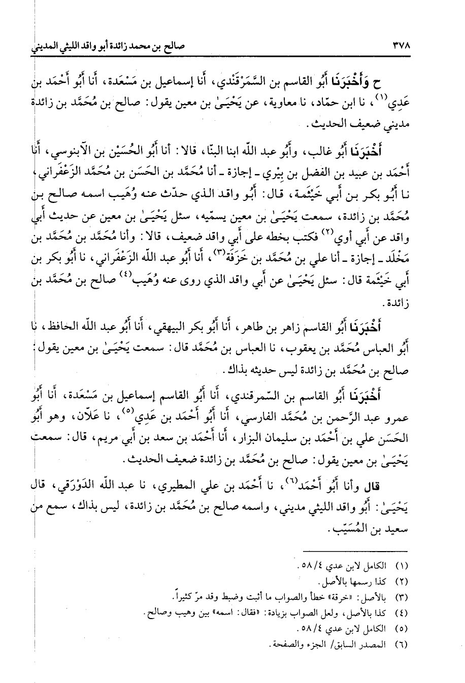 ح وأخبرنا أبو القاسم بن السمرقندي أنا إسماعيل بن مسعدة أنا أبو أحمد بن عدي (1) نا ابن حماد نا معاوية عن يحيى بن معين يقول صالح بن محمد بن زائدة مديني ضعيف الحديث أخبرنا أبو غالب وأبو عبد الله ابنا البنا قالا أنا أبو الحسين بن الآبنوسي أنا أحمد بن عبيد بن الفضل بن بيري إجازة أنا محمد بن الحسن بن محمد الزعفراني نا أبو بكر بن أبي خيثمة قال أبو واقد الذي حدث عنه وهيب اسمه صالح بن محمد بن زائدة سمعت يحيى بن معين يسميه سئل يحيى بن معين عن حديث أبي واقد عن أبي أوي (2) فكتب بخطه على أبي واقد ضعيف قالا وأنا محمد بن محمد بن مخلد إجازة أنا علي بن محمد بن خزفة (3) أنا أبو عبد الله الزعفراني نا أبو بكر بن أبي خيثمة قال سئل يحيى عن أبي واقد الذي روى عنه وهيب (4) صالح بن محمد بن زائدة أخبرنا أبو القاسم زاهر بن طاهر أنا أبو بكر البيهقي أنا أبو عبد الله الحافظ نا أبو العباس محمد بن يعقوب نا العباس بن محمد قال سمعت يحيى بن معين يقول ص الح بن محمد بن زائدة ليس حديثه بذاك أخبرنا أبو القاسم بن السمرقندي أنا أبو القاسم إسماعيل بن مسعدة أنا أبو عمرو عبد الرحمن بن محمد الفارسي أنا أبو أحمد بن عدي (5) نا علان وهو أبو الحسن علي بن أحمد بن سليمان البزار أنا أحمد بن سعد بن أبي مريم قال سمعت يحيى بن معين يقول صالح بن محمد بن زائدة ضعيف الحديث قال وأنا أبو أحمد (6) نا أحمد بن علي المطيري نا عبد الله الدورقي قال يحيى أبو واقد الليثي مديني واسمه صالح بن محمد بن زائدة ليس بذاك سمع من سعيد بن المسيب