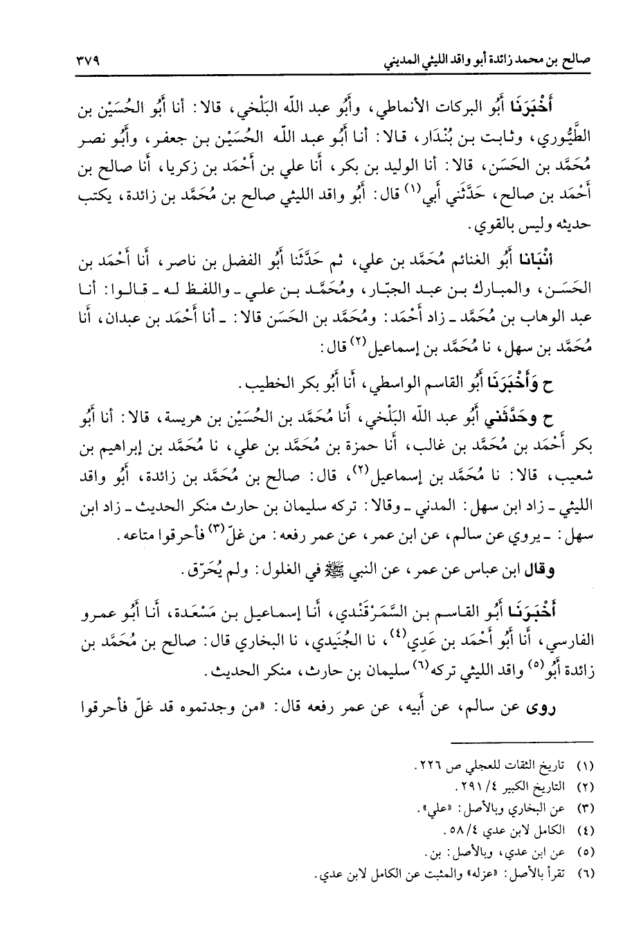 أخبرنا أبو البركات الأنماطي وأبو عبد الله البلخي قالا أنا أبو الحسين بن الطيوري وثابت بن بندار قالا أنا أبو عبد الله الحسين بن جعفر وأبو نصر محمد بن الحسن قالا أنا الوليد بن بكر أنا علي بن أحمد بن زكريا أنا صالح بن أحمد بن صالح حدثني أبي (1) قال أبو واقد الليثي صالح بن محمد بن زائدة يكتب حديثه وليس بالقوي أنبأنا أبو الغنائم محمد بن علي ثم حدثنا أبو الفضل بن ناصر أنا أحمد بن الحسن والمبارك بن عبد الجبار ومحمد بن علي واللفظ له قالوا أنا عبد الوهاب بن محمد زاد أحمد ومحمد بن الحسن قالا أنا أحمد بن عبدان أنا محمد بن سهل نا محمد بن إسماعيل (2) قال ح وأخبرنا أبو القاسم الواسطي أنا أبو بكر الخطيب ح وحدثني أبو عبد الله البلخي أنا محمد بن الحسين بن هريسة قالا أنا أبو بكر أحمد بن محمد بن غالب أنا حمزة بن محمد بن علي نا محمد بن إبراهيم بن شعيب قالا نا محمد بن إسماعيل (2) قال صالح بن محمد بن زائدة أبو واقد الليثي زاد ابن سهل المدني وقالا تركه سليمان بن حارث منكر الحديث زاد ابن سهل يروي عن سالم عن ابن عمر عن عمر رفعه من غل (3) فأحرقوا متاعه وقال ابن عباس عن عمر عن النبي (صلى الله عليه وسلم) في الغلول ولم يحرق أخبرنا أبو القاسم بن السمرقندي أنا إسماعيل بن مسعدة أنا أبو عمرو الفارسي أنا أبو أحمد بن عدي (4) نا الجنيدي نا البخاري قال صالح بن محمد بن زائدة أبو (5) واقد الليثي تركه (6) سليمان بن حارث منكر الحديث روى عن سالم عن أبيه عن عمر رفعه قال من وجدتموه قد غل فأحرقوا