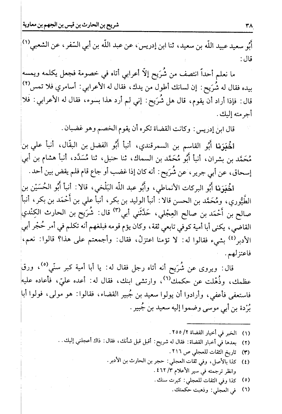 أبو سعيد عبيد الله بن سعيد ثنا ابن إدريس عن عبد الله بن أبي السفر عن الشعبي (1) قال ما نعلم أحدا انتصف من شريح إلا أعرابي أتاه في خصومة فجعل يكلمه ويمسه بيده فقال له شريح إن لسانك أطول من يدك فقال له الأعرابي أسامري فلا تمس (2) قال فإذا أراد أن يقوم قال هل شريح إني لم أرد هذا بسوء فقال له الأعرابي فلا أجرمته إليك قال ابن إدريس وكانت القضاة تكره أن يقوم الخصم وهو غضبان أخبرنا أبو القاسم بن السمرقندي أنبأ أبو الفضل بن البقال أنبأ علي بن محمد بن بشران أنبأ أبو محمد بن السماك ثنا حنبل ثنا مسدد أنبأ هشام بن أبي إسحاق عنأبي جرير عن شريح أن كان إذا غضب أو جاع قام فلم يقض بين أحد أخبرنا أبو البركات الأنماطي وأبو عبد الله البلخي قالا أنبأ أبو الحسين بن الطيوري ومحمد بن الحسن قالا أنبأ الوليد بن بكر أنبأ علي بن أحمد بن بكر أنبأ صالح بن أحمد بن صالح العجلي حدثني أبي (3) قال شريح بن الحارث الكندي القاضي يكنى أبا أمية كوفي تابعي ثقة وكان يؤم قومه فبلغهم أنه تكلم في أمر حجر أبي الأدبر (4) بشئ فقالوا له لا تؤمنا اعتزل فقال وأجمعتم على هذا قالوا نعم فاعتزلهم قال ويروى عن شريح أنه أتاه رجل فقال له يا أبا أمية كبر سني (5) ورق عظمك وذهلت عن حكمك (6) وارتشى ابنك فقال له أعده علي فأعاده عليه فاستعفي فأعفي وأرادوا أن يولوا سعيد بن جبير القضاء فقالوا هو مولى فولوا أبا بردة بنأبي موسى وضموا إليه سعيد بن جبير