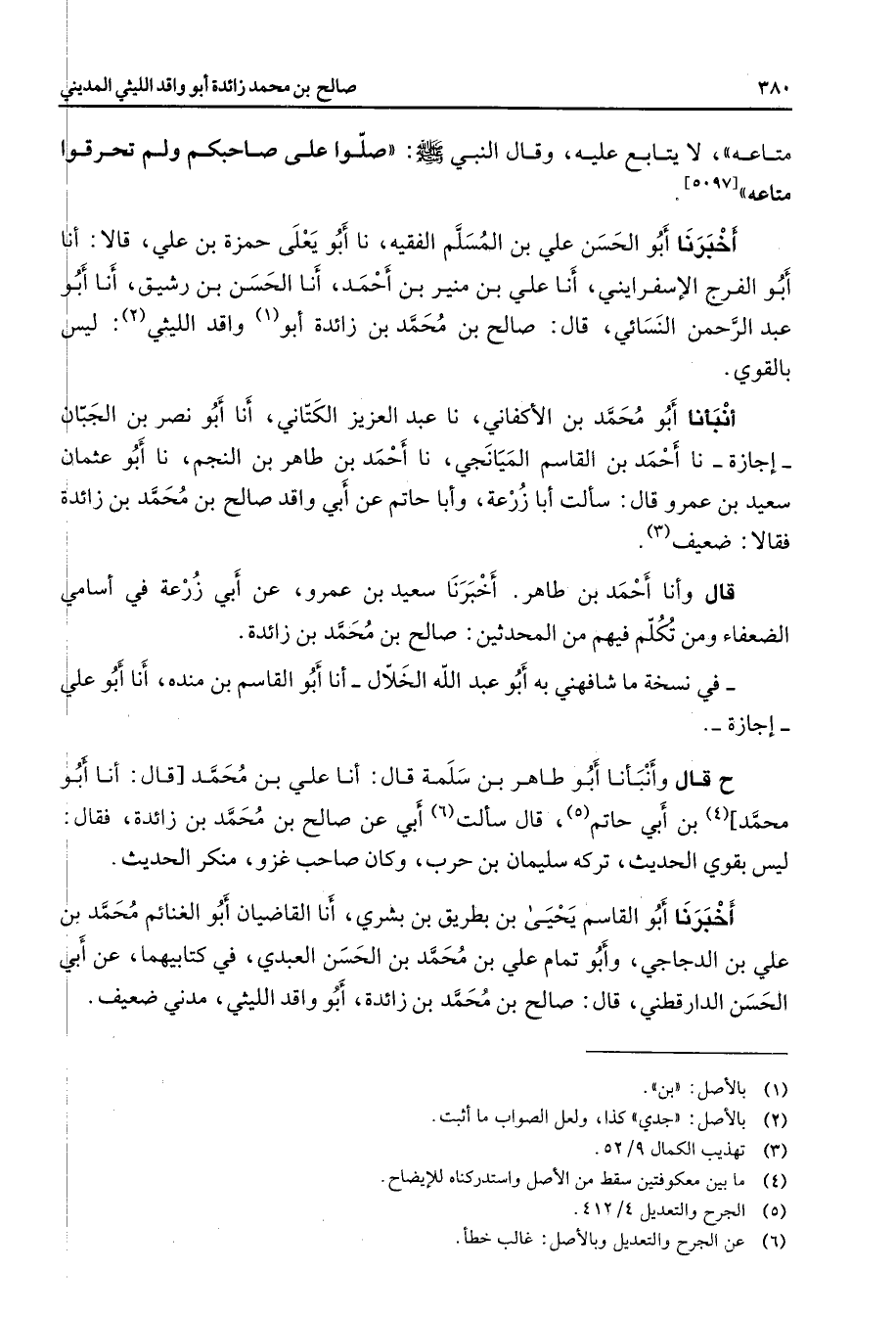 متاعه لا يتابع عليه وقال النبي (صلى الله عليه وسلم) صلوا على صاحبكم ولم تحرقوا متاعه أخبرنا أبو الحسن علي بن المسلم الفقيه نا أبو يعلى حمزة بن علي قالا أنا أبو الفرج الإسفرايني أنا علي بن منير بن أحمد أنا الحسن بن رشيق أنا أبو عبد الرحمن النسائي قال صالح بن محمد بن زائدة أبو (1) واقد الليثي (2) ليس بالقوي أنبأنا أبو محمد بن الأكفاني نا عبد العزيز الكتاني أنا أبو نصر بن الجبان إجازة نا أحمد بن القاسم الميانجي نا أحمد بن طاهر بن النجم نا أبو عثمان سعيد بن عمرو قال سألت أبا زرعة وأبا حاتم عن أبي واقد صالح بن محمد بن زائدة فقالا ضعيف (3) قال وأنا أحمد بن طاهر أخبرنا سعيد بن عمرو عن أبي زرعة في أسامي الضعفاء ومن تكلم فيهم من المحدثين صالح بن محمد بن زائدة في نسخة ما شافهني به أبو عبد الله الخلال أنا أبو القاسم بن منده أنا أبو علي إجازة ح قال وأنبأنا أبو طاهر بن سلمة قال أنا علي بن محمد قال أنا أبو محمد (4) بن أبي حاتم (5) قال سألت (6) أبي عن صالح بن محمد بن زائدة فقال ليس بقوي الحديث تركه سليمان بن حرب وكان صاحب غزو منكر الحديث أخبرنا أبو القاسم يحيى بن بطريق بن بشري أنا القاضيان أبو الغنائم محمد بن علي بن الدجاجي وأبو تمام علي بن محمد بن الحسن العبدي في كتابيهما عنأبي الحسن الدارقطني قال صالح بن محمد بن زائدة أبو واقد الليثي مدني ضعيف