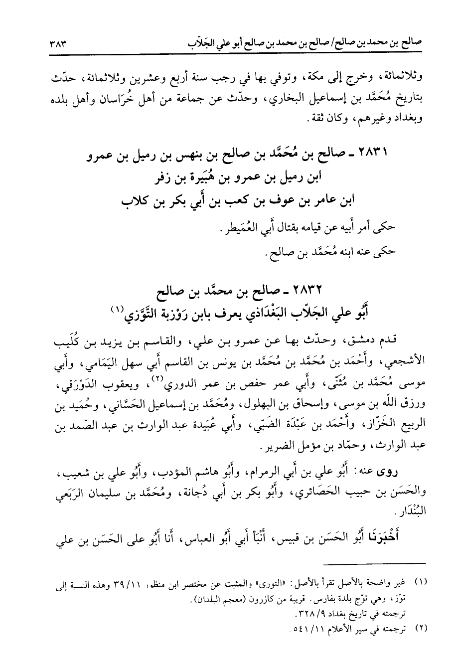 2832 - صالح بن محمد بن صالح أبو علي الجلاب البغدادي يعرف بابن روزبة التوزي (1) قدم دمشق وحدث بها عن عمرو بن علي والقاسم بن يزيد بن كليب الأشجعي وأحمد بن محمد بن محمد بن يونس بن القاسم أبي سهل اليمامي وأبي موسى محمد بن مثنى وأبي عمر حفص بن عمر الدوري (2) ويعقوب الدورقي ورزق الله بن موسى وإسحاق بن البهلول ومحمد بن إسماعيل الحساني وحميد بن الربيع الخزاز وأحمد بن عبدة الضبي وأبي عبيدة عبد الوارث بن عبد الصمد بن عبد الوارث وحماد بن مؤمل الضرير