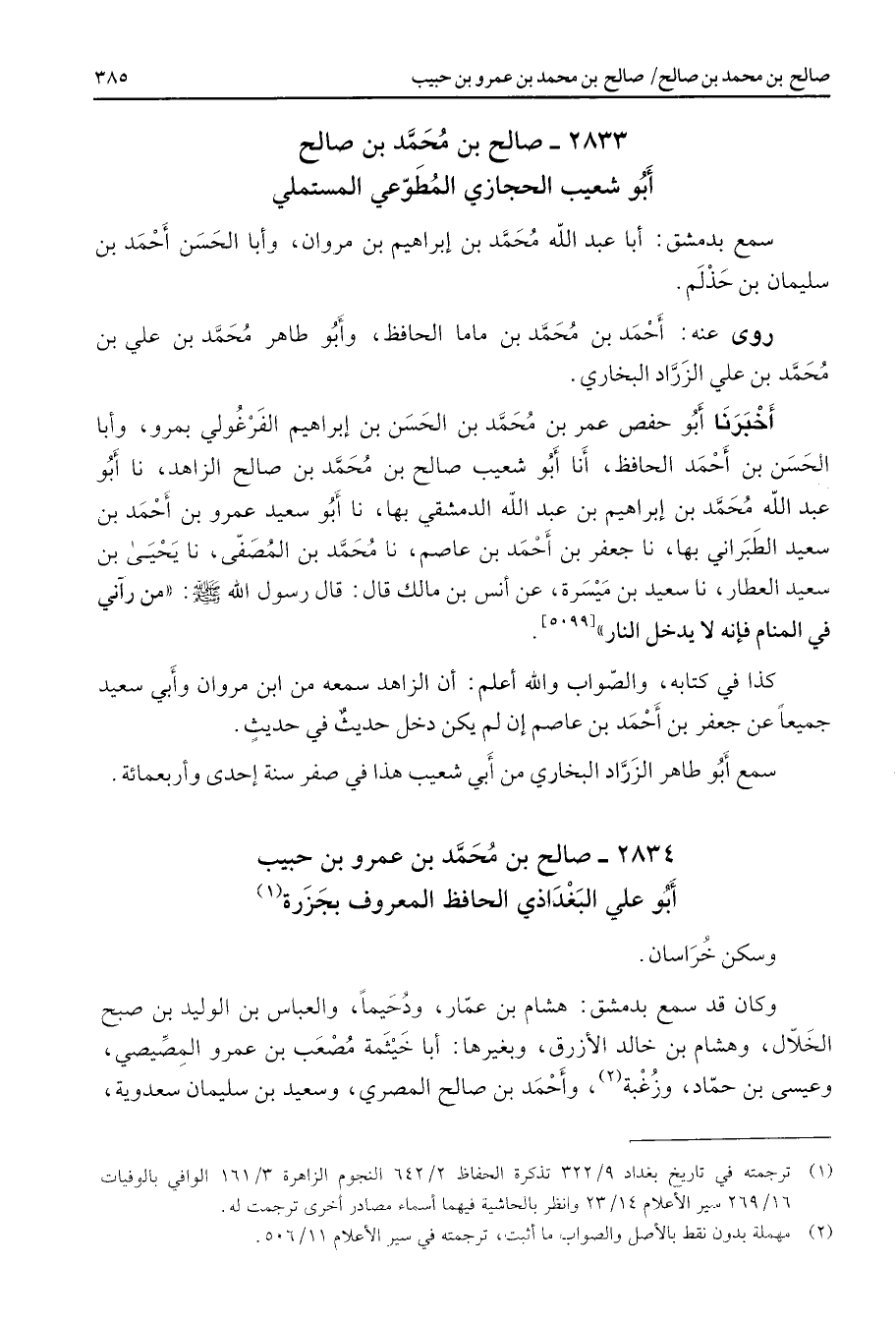 2833 - صالح بن محمد بن صالح أبو شعيب الحجازي المطوعي المستلمي سمع بدمشق أبا عبد الله محمد بن إبراهيم بن مروان وأبا الحسن أحمد بن سليمان بن حذلم روى عنه أحمد بن محمد بن ماما الحافظ وأبو طاهر محمد بن علي بن محمد بن علي الزراد البخاري أخبرنا أبو حفص عمر بن محمد بن الحسن بن إبراهيم الفرغولي بمرو وأبا الحسن بن أحمد الحافظ أنا أبو شعيب صالح بن محمد بن صالح الزاهد نا أبو عبد الله محمد بن إبراهيم بن عبد الله الدمشقي بها نا أبو سعيد عمرو بن أحمد بن سعيد الطبراني بها نا جعفر بن أحمد بن عاصم نا محمد بن المصفى نا يحيى بن سعيد العطار نا سعيد بن ميسرة عن أنس بن مالك قال قال رسول الله (صلى الله عليه وسلم) من رآني في المنام فإنه لا يدخل النار كذا في كتابه والصواب والله أعلم أن الزاهد سمعه من ابن مروان وأبي سعيد جميعا عن جعفر بن أحمد بن عاصم إن لم يكن دخل حديث في حديث سمع أبو طاهر الزراد البخاري من أبي شعيب هذا في صفر سنة إحدى وأربعمائة