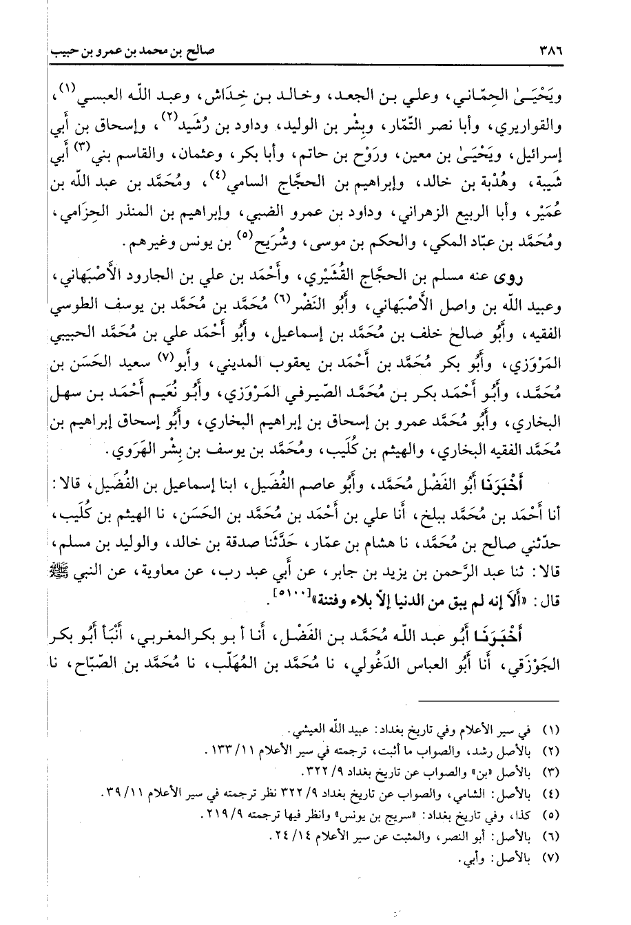 ويحيى الحماني وعلي بن الجعد وخالد بن خداش وعبد الله العبسي (1) والقواريري وأبا نصر النمار وبشر بن الوليد وداود بن رشيد (2) وإسحاق بن أبي إسرائيل ويحيى بن معين وروح بن حاتم وأبا بكر وعثمان والقاسم بني (3) أبي شيبة وهدبة بن خالد وإبراهيم بن الحجاج السامي (4) ومحمد بن عبد الله بن عمير وأبا الربيع الزهراني وداود بن عمرو الضبي وإبراهيم بن المنذر الحزامي ومحمد بن عباد المكي والحكم بن موسى وشريح (5) بن يونس وغيرهم روى عنه مسلم بن الحجاج القشيري وأحمد بن علي بن الجارود الأصبهاني وعبيد الله بن واصل الأصبهاني وأبو النضر (6) محمد بن محمد بن يوسف الطوسي الفقيه وأبو صالح خلف بن محمد بن إسماعيل وأبو أحمد علي بن محمد الحبيبي المروزي وأبو بكر محمد بن أحمد بن يعقوب المديني وأبو (7) سعيد الحسن بن محمد وأبو أحمد بكر بن محمد الصيرفي المروزي وأبو نعيم أحمد بن سهل البخاري وأبو محمد عمرو بن إسحاق بن إبراهيم البخاري وأبو إسحاق إبراهيم بن محمد الفقيه البخاري والهيثم بن كليب ومحمد بن يوسف بن بشر الهروي أخبرنا أبو الفضل محمد وأبو عاصم الفضيل ابنا إسماعيل بن الفضيل قالا أنا أحمد بن محمد ببلخ أنا علي بن أحمد بن محمد بن الحسن نا الهيثم بن كليب حدثني صالح بن محمد نا هشام بن عمار حدثنا صدقة بن خالد والوليد بن مسلم قالا ثنا عبد الرحمن بن يزيد بن جابر عن أبي عبد رب عن معاوية عن النبي (صلى الله عليه وسلم) قال ألا إنه لم يبق من الدنيا إلا بلاء وفتنة أخبرنا أبو عبد الله محمد بن الفضل أنا أبو بكر المغربي أنبأ أبو بكر الجوزقي أنا أبو العباس الدغولي نا محمد بن المهلب نا محمد بن الصباح نا