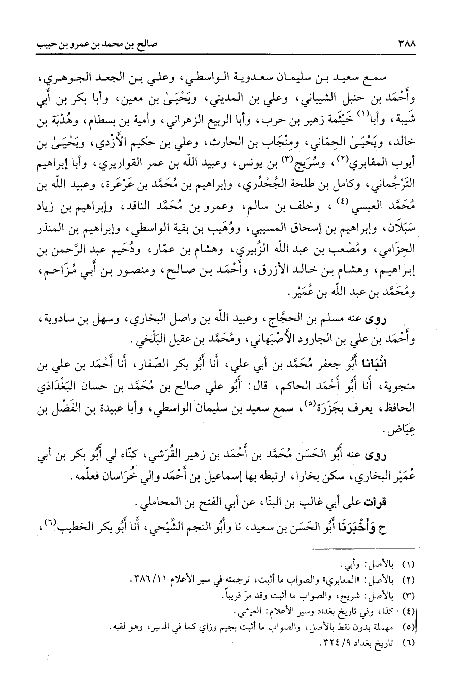 سمع سعيد بن سليمان سعدوية الواسطي وعلي بن الجعد الجوهري وأحمد بن حنبل الشيباني وعلي بن المديني ويحيى بن معين وأبا بكر بن أبي شيبة وأبا (1) خيثمة زهير بن حرب وأبا الربيع الزهراني وأمية بن بسطام وهدبة بن خالد ويحيى الحماني ومنجاب بن الحارث وعلي بن حكيم الأزدي ويحيى بن أيوب المقابري (2) وسريج (3) بن يونس وعبيد الله بن عمر القواريري وأبا إبراهيم الترجماني وكامل بن طلحة الجحدري وإبراهيم بن محمد بن عرعرة وعبيد الله بن محمد العبسي (4) وخلف بن سالم وعمرو بن محمد الناقد وإبراهيم بن زياد سبلان وإبراهيم بن إسحاق المسيبي ووهيب بن بقية الواسطي وإبراهيم بن المنذر الحزامي ومصعب بن عبد الله الزبيري وهشام بن عمار ودحيم عبد الرحمن بن إبراهيم وهشام بن خالد الأزرق وأحمد بن صالح ومنصور بن أبي مزاحم ومحمد بن عبد الله بن عمير روى عنه مسلم بن الحجاج وعبيد الله بن واصل البخاري وسهل بن سادوية وأحمد بن علي بن الجارود الأصبهاني ومحمد بن عقيل البلخي أنبأنا أبو جعفر محمد بن أبي علي أنا أبو بكر الصفار أنا أحمد بن علي بن منجوية أنا أبو أحمد الحاكم قال أبو علي صالح بن محمد بن حسان البغداذي الحافظ يعرف بجزرة (5) سمع سعيد بن سليمان الواسطي وأبا عبيدة بن الفضل بن عياض روى عنه أبو الحسن محمد بن أحمد بن زهير القرشي كناه لي أبو بكر بن أبي عمير البخاري سكن بخارا ارتبطه بها إسماعيل بن أحمد والي خراسان فعلمه قرأت على أبي غالب بن البنا عن أبي الفتح بن المحاملي ح وأخبرنا أبو الحسن بن سعيد نا وأبو النجم الشيحي أنا أبو بكر الخطيب (7)