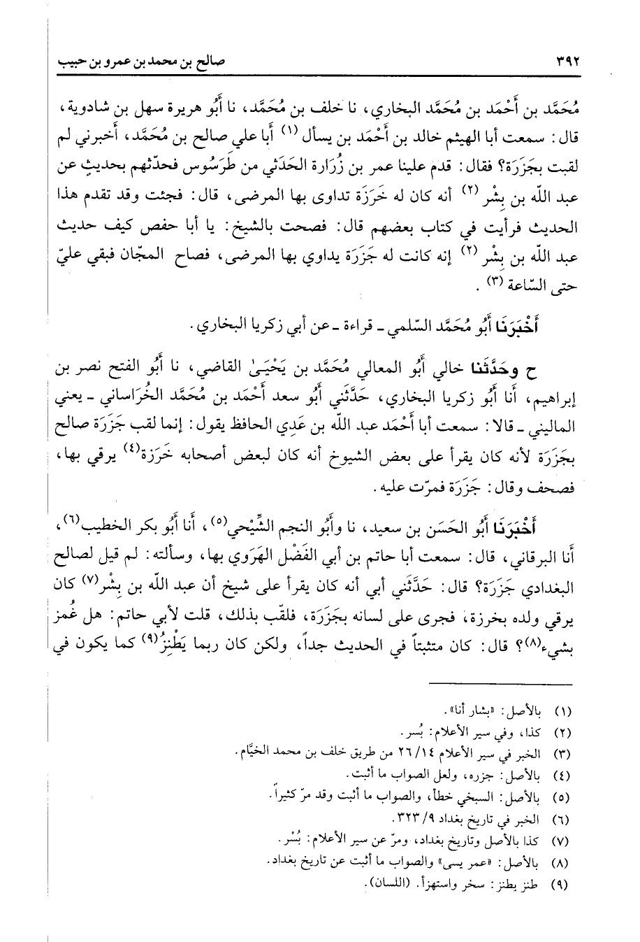 محمد بن أحمد بن محمد البخاري نا خلف بن محمد نا أبو هريرة سهل بن شادوية قال سمعت أبا الهيثم خالد بن أحمد بن يسأل (1) أبا علي صالح بن محمد أخبرني لم لقبت بجزرة فقال قدم علينا عمر بن زرارة الحدثي من طرسوس فحدثهم بحديث عن عبد الله بن بشر (2) أنه كان له خرزة تداوى بها المرضى قال فجئت وقد تقدم هذا الحديث فرأيت في كتاب بعضهم قال فصحت بالشيخ يا أبا حفص كيف حديث عبد الله بن بشر (2) إنه كانت له جزرة يداوي بها المرضى فصاح المجان فبقي علي حتى الساعة (3) أخبرنا أبو محمد السلمي قراءة عن أبي زكريا البخاري ح وحدثنا خالي أبو المعالي محمد بن يحيى القاضي نا أبو الفتح نصر بن إبراهيم أنا أبو زكريا البخاري حدثني أبو سعد أحمد بن محمد الخراساني يعني الماليني قالا سمعت أبا أحمد عبد الله بن عدي الحافظ يقول إنما لقب جزرة صالح بجزرة لأنه كان يقرأ على بعض الشيوخ أنه كان لبعض أصحابه خرزة (4) يرقي بها فصحف وقال جزرة فمرت عليه أخبرنا أبو الحسن بن سعيد ناوأبو النجم الشيحي (5) أنا أبو بكر الخطيب (6) أنا البرقاني قال سمعت أبا حاتم بن أبي الفضل الهروي بها وسألته لم قيل لصالح البغدادي جزرة قال حدثني أبي أنه كان يقرأ على شيخ أن عبد الله بن بشر (7) كان يرقي ولده بخرزة فجرى على لسانه بجزرة فلقب بذلك قلت لأبي حاتم هل غمز بشئ (8) قال كان متثبتا في الحديث جدا ولكن كان ربما يطنز (9) كما يكون في