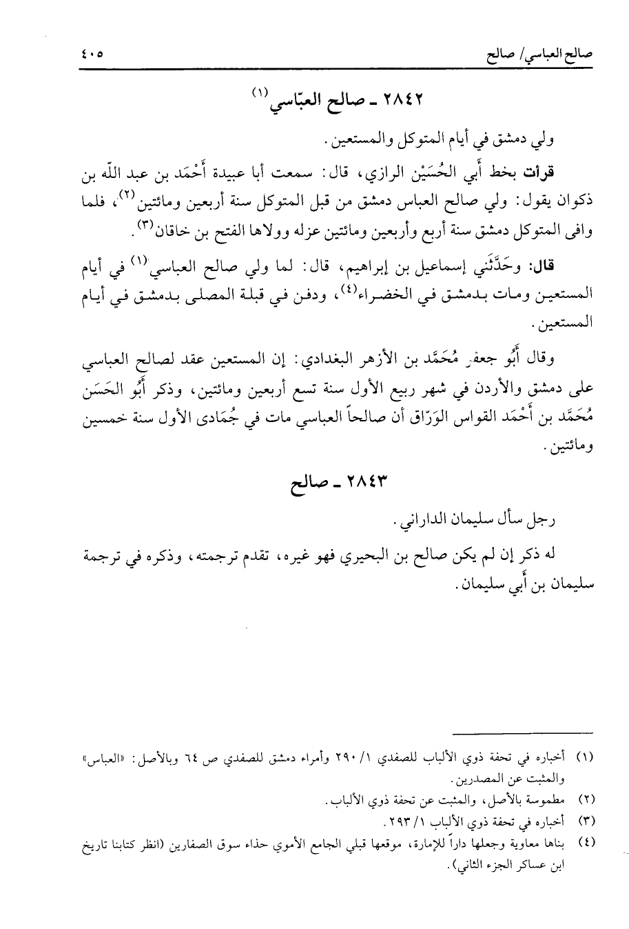 2842 - صالح العباسي (1) ولي دمشق في أيام المتوكل والمستعين قرأت بخط أبي الحسين الرازي قال سمعت أبا عبيدة أحمد بن عبد الله بن ذكوان يقول ولي صالح العباس دمشق من قبل المتوكل سنة أربعين ومائتين (2) فلما وافى المتوكل دمشق سنة أربع وأربعين ومائتين عزله وولاها الفتح بن خاقان (3) قال وحدثني إسماعيل بن إبراهيم قال لما ولي صالح العباسي (1) في أيام المستعين ومات بدمشق في الخضراء (4) ودفن في قبلة المصلى بدمشق في أيام المستعين وقال أبو جعفر محمد بن الأزهر البغدادي إن المستعين عقد لصالح العباسي على دمشق والأردن في شهر ربيع الأول سنة تسع أربعين ومائتين وذكر أبو الحسن محمد بن أحمد القواس الوراق أن صالحا العباسي مات في جمادى الأول سنة خمسين ومائتين 2843 صالح رجل سأل سليمان الداراني له ذكر إن لم يكن صالح بن البحيري فهو غيره تقدم ترجمته وذكره في ترجمة سليمان بن أبي سليمان