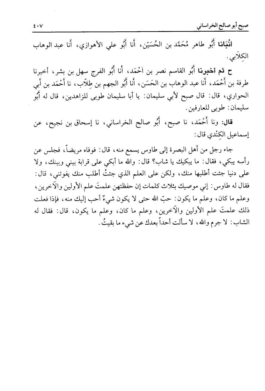 أنبأنا أبو طاهر محمد بن الحسين أنا أبو علي الأهوازي أنا عبد الوهاب الكلابي ح ثم أخبرنا أبو القاسم نصر بن أحمد أنا أبو الفرج سهل بن بشر أخبرنا طرفة بن أحمد أنا عبد الوهاب بن الحسن أنا أبو الجهم بن طلاب نا أحمد بن أبي الحواري قال قال صبح لأبي سليمان يا أبا سليمان طوبى للزاهدين قال له أبو سليمان طوبى للعارفين قال ونا أحمد نا صبح أبو صالح الخراساني نا إسحاق بن نجيح عن إسماعيل الكندي قال جاء رجل من أهل البصرة إلى طاوس يسمع منه قال فوفاه مريضا فجلس عن رأسه يبكي فقال ما يبكيك يا شاب قال والله ما أبكي على قرابة بيني وبينك ولا على دنيا جئت أطلبها منك ولكن على العلم الذي جئت أطلب منك يفوتني قال فقال له طاوس إني موصيك بثلاث كلمات إن حفظتهن علمت علم الأولين والآخرين وعلم ما كان وعلم ما يكون حب الله حتى لا يكون شئ أحب إليك منه فإذا فعلت ذلك علمت علم الأولين والآخرين وعلم ما كان وعلم ما يكون قال فقال له الشاب لا جرم والله لا سألت أحدا بعدك عن شئ ما بقيت