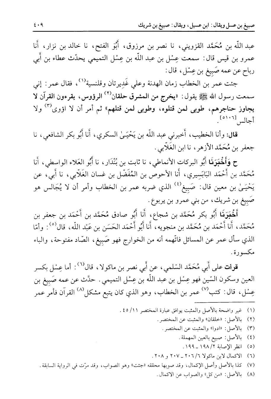 عبد الله بن محمد القزويني نا نصر بن مرزوق أبو الفتح نا خالد بن نزار أنا عمرو بن قيس قال سمعت عسل بن عبد الله بن عسل التميمي يحدث عطاء بن أبي رباح عن عمه صبيغ بن عسل قال جئت عمر بن الخطاب زمان الهدنة وعلي غديرتان وقلنسية (1) فقال عمر إني سمعت رسول الله (صلى الله عليه وسلم) يقول يخرج من المشرق حلقان (2) الرؤوس يقرءون القرآن لا يجاوز حناجرهم طوبى لمن قتلوه وطوبى لمن قتلهم ثم أمر أن لا اؤوى (3) ولا أجالس قال وأنا الخطيب أخبرني عبد الله بن يحيى السكري أنا أبو بكر الشافعي نا جعفر بن محمد الأزهر نا ابن الغلابي ح وأخبرنا أبو البركات الأنماطي نا ثابت بن بندار نا أبو العلاء الواسطي أنا محمد بن أحمد البابسيري أنا الأحوص بن المفضل بن غسان الغلابي نا أبي عن يحيى بن معين قال صبيغ (4) الذي ضربه عمر بن الخطاب وأمر أن لا يجالس هو صبيغ بن شريك من بني عمرو بن يربوع أخبرنا أبو بكر محمد بن شجاع أنا أبو صادق محمد بن أحمد بن جعفر بن محمد أنا أحمد بن محمد بن منجويه أنا أبو أحمد الحسن بن عبد الله قال (5) وأما الذي سأل عمر عن المسائل فاتهمه أنه من الخوارج فهو صبيغ الصاد مفتوحة والباء مكسورة قرأت على أبي محمد السلمي عن أبي نصر بن ماكولا قال (6) أما عسل بكسر العين وسكون السين فهو عسل بن عبد الله بن عسل التميمي حدث عن عمه صبيغ بن عسل قال كتب (7) عمر بن الخطاب وهو الذي كان يتبع مشكل (8) القرآن فأمر عمر