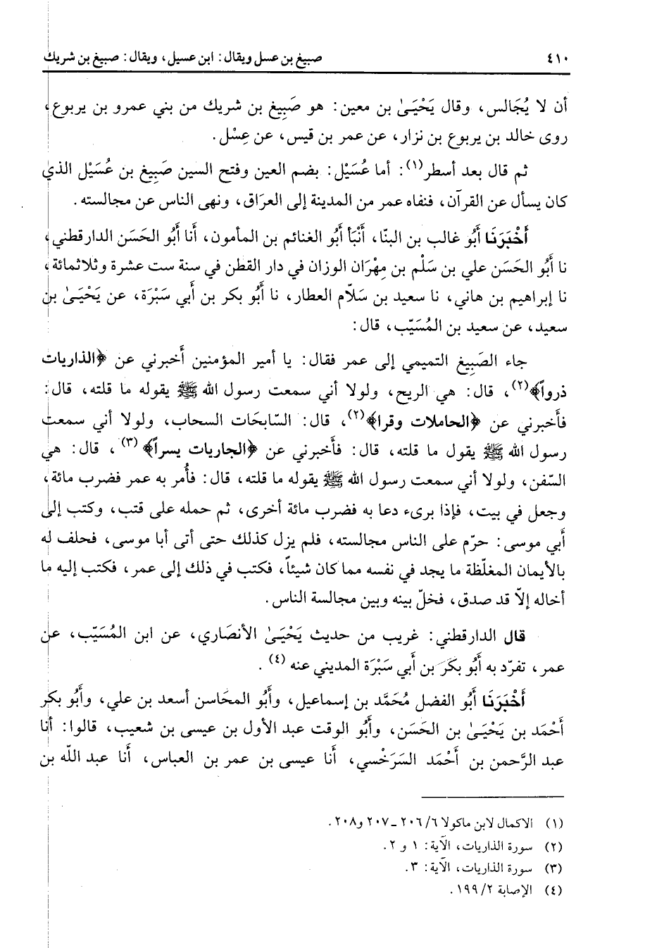 أن لا يجالس وقال يحيى بن معين وهو صبيغ بن شريك من بني عمرو بن يربوع روى خالد بن يربوع بن نزار عن عمر بن قيس عن عسل ثم قال بعد أسطر (1) أما عسيل بضم العين وفتح السين صبيغ بن عسيل الذي كان يسأل عن القرآن فنفاه عمر من المدينة إلى العراق ونهى الناس عن مجالسته أخبرنا أبو غالب بن البنا أنبأ أبو الغنائم بن المأمون أنا أبو الحسن الدارقطني نا أبو الحسن علي بن سلم بن مهران الوزان في دار القطن في سنة ست عشرة وثلاثمائة نا إبراهيم بن هاني نا سعيد بن سلام العطار نا أبو بكر بن أبي سبرة عن يحيى بن سعيد عن سعيد بن المسيب قال جاء الصبيغ التميمي إلى عمر فقال يا أمير المؤمنين أخبرني عن " الذاريات ذروا " (2) قال هي الريح ولولا أني سمعت رسول الله (صلى الله عليه وسلم) يقوله ما قلته قال فأخبرني عن " الحاملات وقرا " (2) قال السابحات السحاب ولولا أني سمعت رسول الله (صلى الله عليه وسلم) يقول ما قلته قال فأخبرني عن " الجاريات يسرا " (3) قال هي السفن ولولا أني سمعت رسول الله (صلى الله عليه وسلم) يقوله ما قلته قال فأمر به عمر فضرب مائة وجعل في بيت فإذا برئ دعا به فضرب مائة أخرى ثم حمله على قتب وكتب إلى أبي موسى حرم على الناس مجالسته فلم يزل كذلك حتى أتى أبا موسى فحلف له بالإيمان المغلظة ما يجد في نفسه مما كان شيئا فكتب في ذلك إلى عمر فكتب إليه ما أخاله إلا قد صدق فخل بينه وبين مجالسة الناس قال الدارقطني غريب من حديث يحيى الأنصاري عن ابن المسيب عن عمر تفرد به أبو بكر بن أبي سبرة المديني عنه (4) أخبرنا أبو الفضل محمد بن إسماعيل وأبو المحاسن أسعد بن علي وأبو بكر أحمد بن يحيى بن الحسن وأبو الوقت عبد الأول بن عيسى بن شعيب قالوا أنا عبد الرحمن بن أحمد السرخسي أنا عيسى بن عمر بن العباس أنا عبد الله بن