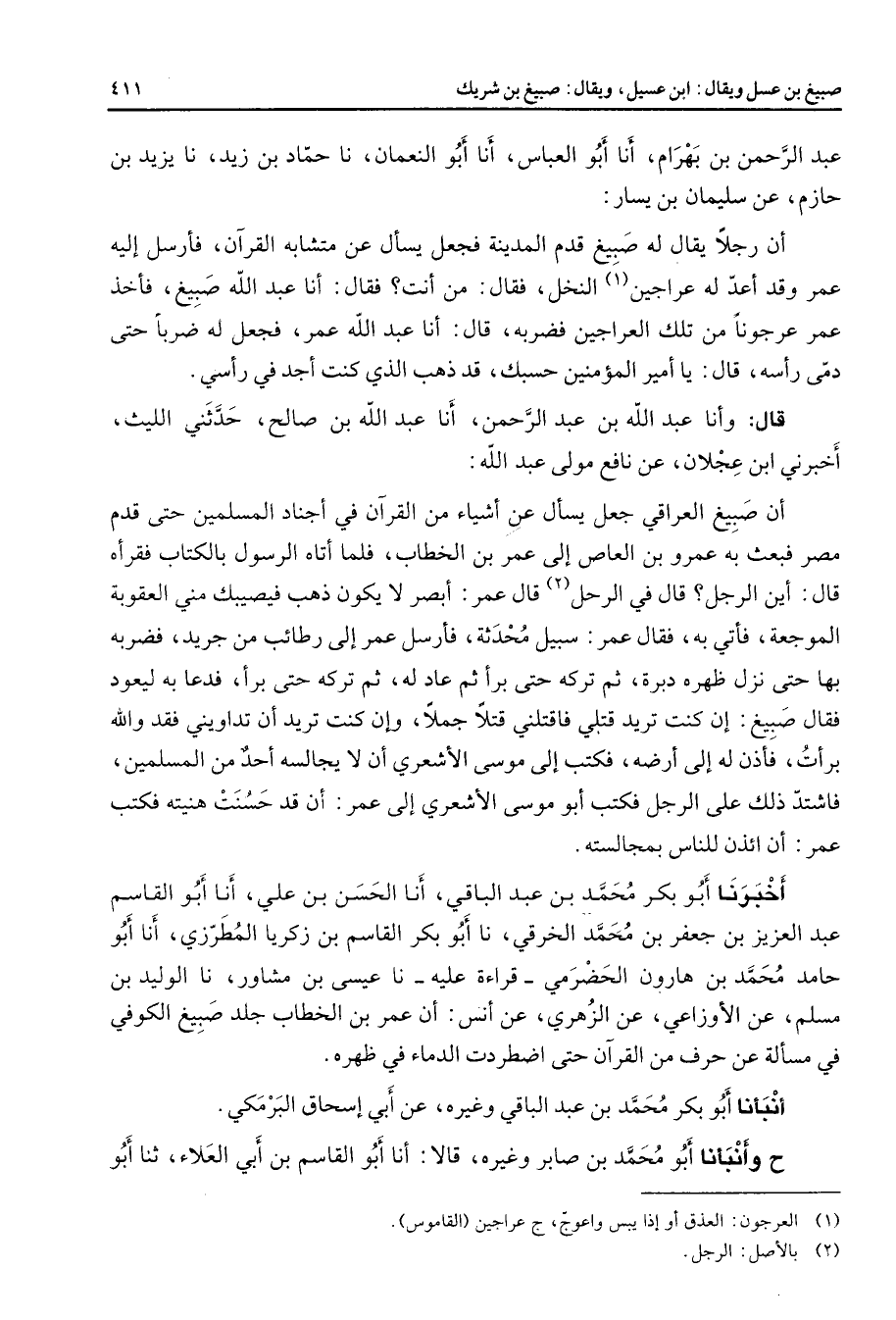 عبد الرحمن بن بهرام أنا أبو العباس أنا أبو النعمان نا حماد بن زيد نا يزيد بن حازم عن سليمان بن يسار أن رجلا يقال له صبيغ قدم المدينة فجعل يسأل عن متشابه القرآن فأرسل إليه عمر وقد أعد له عراجين (1) النخل فقال من أنت فقال أنا عبد الله صبيغ فأخذ عمر عرجونا من تلك العراجين فضربه قال أنا عبد الله عمر فجعل له ضربا حتى دمى رأسه قال يا أمير المؤمنين حسبك قد ذهب الذي كنت أجد في رأسي قال وأنا عبد الله بن عبد الرحمن أنا عبد الله بن صالح حدثني الليث أخبرني ابن عجلان عن نافع مولى عبد الله أن صبيغ العراقي جعل يسأل عن أشياء من القرآن في أجناد المسلمين حتى قدم مصر فبعث به عمرو بن العاص إلى عمر بن الخطاب فلما أتاه الرسول بالكتاب فقرأه قال أين الرجل قال في الرحل (2) قال عمر أبصر لا يكون ذهب فيصيبك مني العقوبة الموجعة فأتي به فقال عمر سبيل محدثة فأرسل عمر إلى رطائب من جريد فضربه بها حتى نزل ظهره دبرة ثم تركه حتى برأ ثم عاد له ثم تركه حتى برأ فدعا به ليعود فقال صبيغ إن كنت تريد قتلي فاقتلني قتالا جملا وإن كنت تريد أن تداويني فقد والله برأت فأذن له إلى أرضه فكتب إلى موسى الأشعري أن لا يجالسه أحد من المسلمين فاشتد ذلك على الرجل فكتب أبو موسى الأشعري إلى عمر أن قد حسنت هنيته فكتب عمر أن ائذن للناس بمجالسته أخبرنا أبو بكر محمد بن عبد الباقي أنا الحسن بن علي أنا أبو القاسم عبد العزيز بن جعفر بن محمد الخرقي نا أبو بكر القاسم بن زكريا المطرزي أنا أبو حامد محمد بن هارون الحضرمي قراءة عليه نا عيسى بن مشاور نا الوليد بن مسلم عن الأوزاعي عن الزهري عن أنس أن عمر بن الخطاب جلد صبيغ الكوفي في مسألة عن حرف من القرآن حتى اضطردت الدماء في ظهره أنبأنا أبو بكر محمد بن عبد الباقي وغيره عن أبي إسحاق البرمكي ح وأنبأنا أبو محمد بن صابر وغيره قالا أنا أبو القاسم بن أبي العلاء ثنا أبو