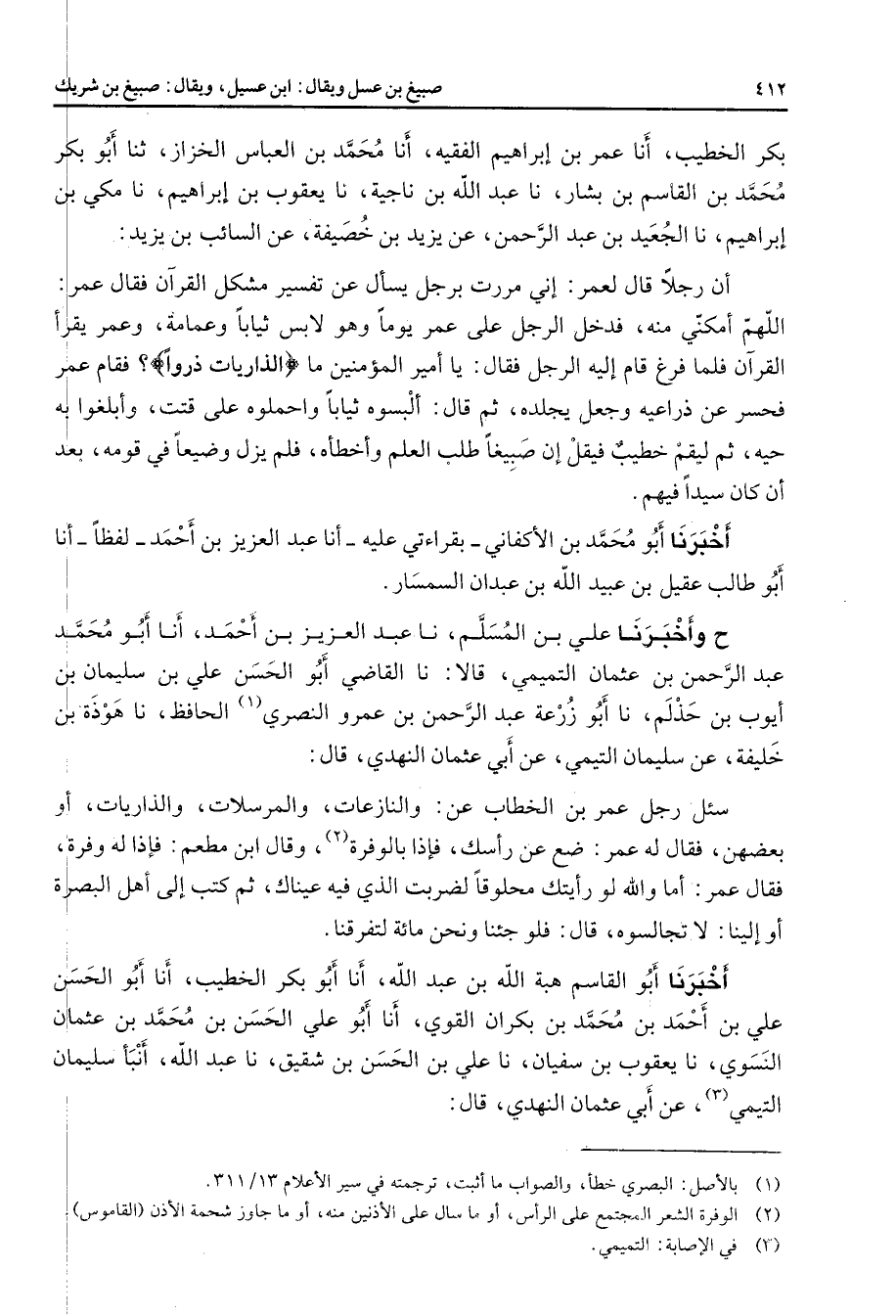 بكر الخطيب أنا عمر بن إبراهيم الفقيه أنا محمد بن العباس الخزاز ثنا أبو بكر محمد بن القاسم بن بشار نا عبد الله بن ناجية نا يعقوب بن إبراهيم نا مكي بن إبراهيم نا الجعيد بن عبد الرحمن عن يزيد بن خصيفة عن السائب بن يزيد أن رجلا قال لعمر إني مررت برجل يسأل عن تفسير مشكل القرآن فقال عمر اللهم أمكني منه فدخل الرجل على عمر يوما وهو لابس ثيابا وعمامة وعمر يقرأ القرآن فلما فرغ قام إليه الرجل فقال يا أمير المؤمنين ما " الذاريات ذروا " فقام عمر فحسر عن ذراعيه وجعل يجلده ثم قال ألبسوه ثيابا واحملوه على قتت وأبلغوا به حيه ثم ليقم خطيب فيقل إن صبيغا طلب العلم وأخطأه فلم يزل وضيعا في قومه بعد أن كان سيدا فيهم أخبرنا أبو محمد بن الأكفاني بقراءتي عليه أنا عبد العزيز بنأحمد لفظا أنا أبو طالب عقيل بن عبيد الله بن عبدان السمسار ح وأخبرنا علي بن المسلم نا عبد العزيز بن أحمد أنا أبو محمد عبد الرحمن بن عثمان التميمي قالا نا القاضي أبو الحسن علي بن سليمان بن أيوب بن حذلم نا أبو زرعة عبد الرحمن بن عمرو النصري (1) الحافظ نا هوذة بن خليفة عن سليمان التيمي عن أبي عثمان النهدي قال سئل رجل عمر بن الخطاب عن والنازعات والمرسلات والذاريات أو بعضهن فقال له عمر ضع عن رأسك فإذا بالوفرة (2) وقال ابن مطعم فإذا له وفرة فقال عمر أما والله لو رأيتك محلوقا لضربت الذي فيه عيناك ثم كتب إلى أهل البصرة أو إلينا لا تجالسوه قال فلو جئنا ونحن مائة لتفرقنا أخبرنا أبو القاسم هبة الله بن عبد الله أنا أبو بكر الخطيب أنا أبو الحسن علي بن أحمد بن محمد بن بكران القوي أنا أبو علي الحسن بن محمد بن عثمان النسوي نا يعقوب بن سفيان نا علي بن الحسن بن شقيق نا عبد الله أنبأ سليمان التيمي (3) عن أبي عثمان النهدي قال