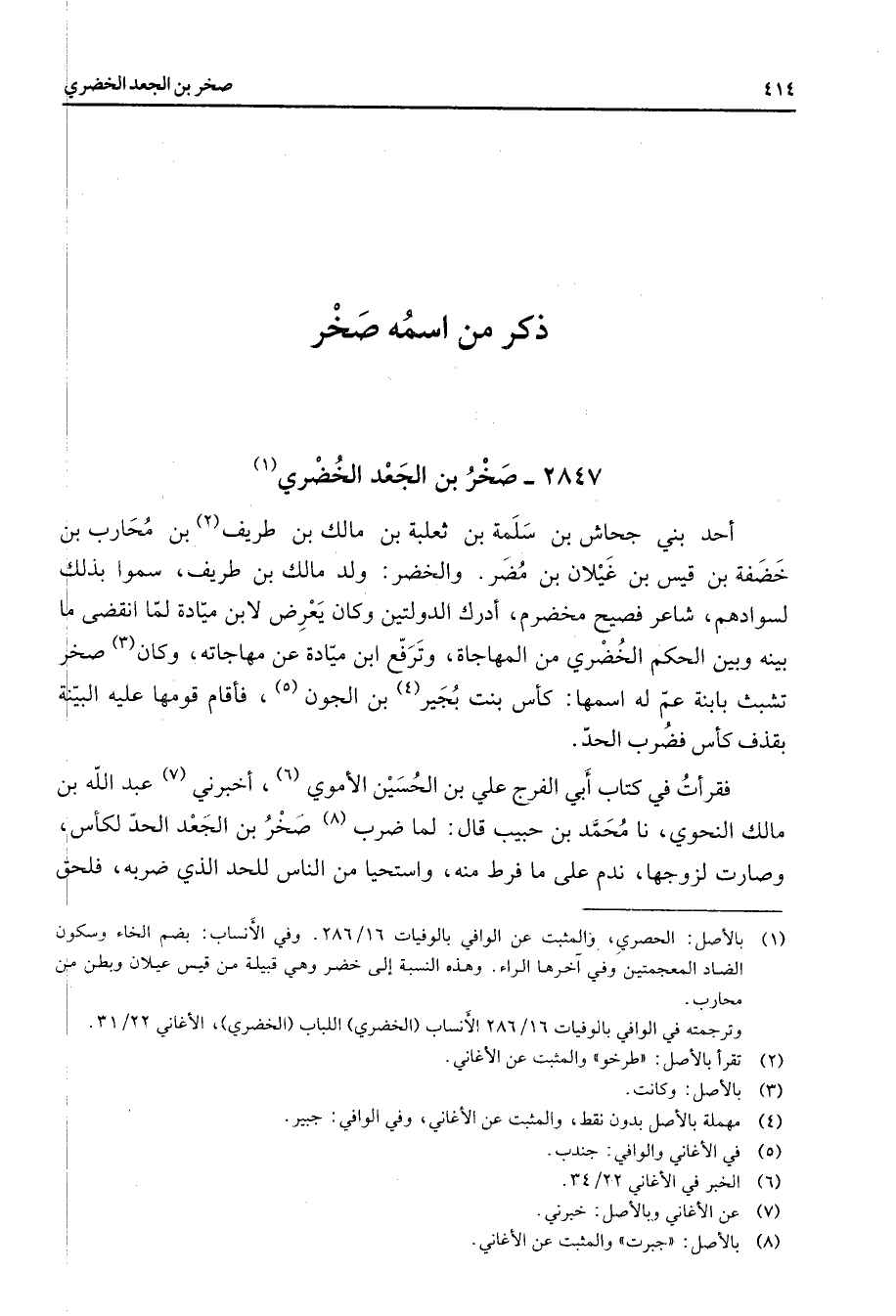 2847 - صخر بن الجعد الخضري (1) أحد بني جحاش بن سلمة بن ثعلبة بن مالك بن طريف (2) بن محارب بن خصفة بن قيس بن غيلان بن مضر والخضر ولد مالك بن طريف سموا بذلك لسوادهم شاعر فصيح مخضرم أدرك الدولتين وكان يعرض لابن ميادة لما انقضى ما بينه وبين الحكم الخضري من المهاجاة وترفع ابن ميادة عن مهاجاته وكان (3) صخر تشبث بابنة عم له اسمها كأس بنت بجير (4) بن الجون (5) فأقام قومها عليه البينة بقذف كأس فضرب الحد فقرأت في كتاب أبي الفرج علي بن الحسين الأموي (6) أخبرني (7) عبد الله بن مالك النحوي نا محمد بن حبيب قال لما ضرب (8) صخر بن الجعد الحد لكأس وصارت لزوجها ندم على فرط منه واستحيا من الناس للحد الذي ضربه فلحق