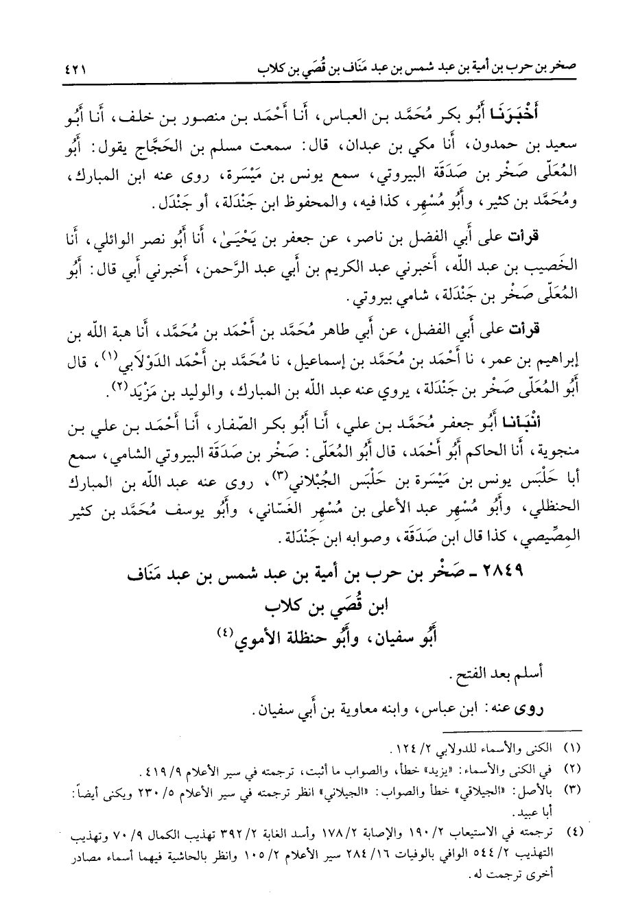2849 - صخر بن حرب بن أمية بن عبد شمس بن عبد مناف ابن قصي بن كلاب أبو سفيان وأبو حنظلة الأموي (4) أسلم بعد الفتح روى عنه ابن عباس وابنه معاوية بن أبي سفيان