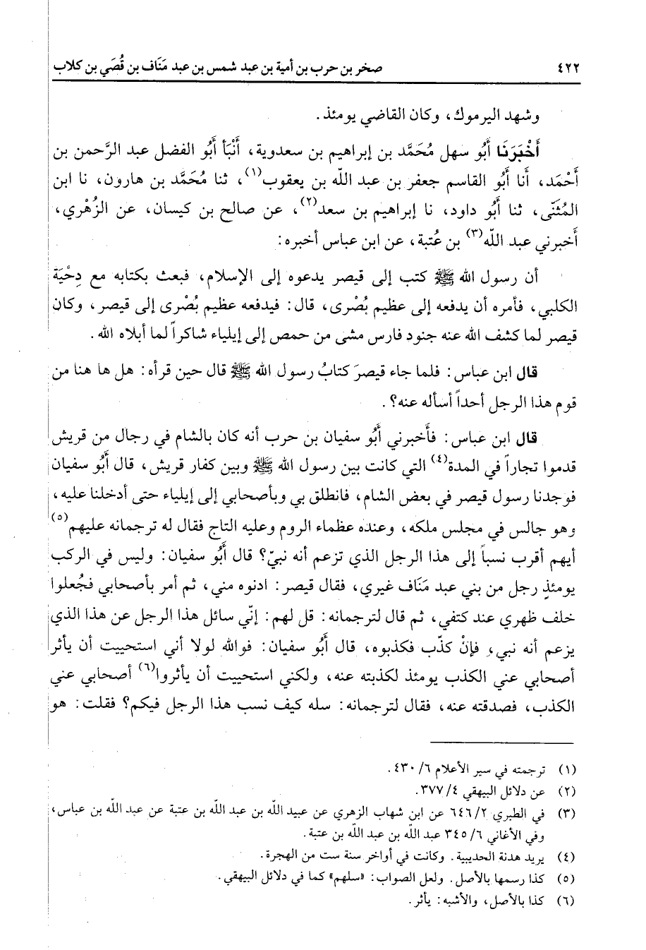وشهد اليرموك وكان القاضي يومئذ أخبرنا أبو سهل محمد بن إبراهيم بن سعدوية أنبأ أبو الفضل عبد الرحمن بن أحمد أنا أبو القاسم جعفر بن عبد الله بن يعقوب (1) ثنا محمد بن هارون نا ابن المثنى ثنا أبو داود نا إبراهيم بن سعد (2) عن صالح بن كيسان عن الزهري أخبرني عبد الله (3) بن عتبة عن ابن عباس أخبره أن رسول الله (صلى الله عليه وسلم) كتب إلى قيصر يدعوه إلى الإسلام فبعث بكتابه مع دحية الكلبي فأمره أن يدفعه إلى عظيم بصرى قال فيدفعه عظيم بصرى إلى قيصر وكان قيصر لما كشف الله عنه جنود فارس مشى من حمص إلى إيلياء شاكرا لما أبلاه الله قال ابن عباس فلما جاء قيصر كتاب رسول الله (صلى الله عليه وسلم) قال حين قرأه هل ها هنا من قوم هذا الرجل أحدا أسأله عنه قال ابن عباس فأخبرني أبو سفيان بن حرب أنه كان بالشام في رجال من قريش قدموا تجارا في المدة (4) التي كانت بين رسول الله (صلى الله عليه وسلم) وبين كفار قريش قال أبو سفيان فوجدنا رسول قيصر في بعض الشام فانطلق بي وبأصحابي إلى إيلياء حتى أدخلنا عليه وهو جالس في مجلس ملكه وعنده عظماء الروم وعليه التاج فقال له ترجمانه عليهم (5) أيهم أقرب نسبا إلى هذا الرجل الذي تزعم أنه نبي قال أبو سفيان وليس في الركب يومئذ رجل من بني عبد مناف غيري فقال قيصر ادنوه مني ثم أمر بأصحابي فجعلوا خلف ظهري عند كتفي ثم قال لترجمانه قل لهم إني سائل هذا الرجل عن هذا الذي يزعم أنه نبي فإن كذب فكذبوه قال أبو سفيان فوالله لولا أني استحييت أن يأثر أصحابي عني الكذب يومئذ لكذبته عنه ولكني استحييت أن يأثروا (6) أصحابي عني الكذب فصدقته عنه فقال لترجمانه سله كيف نسب هذا الرجل فيكم فقلت هو