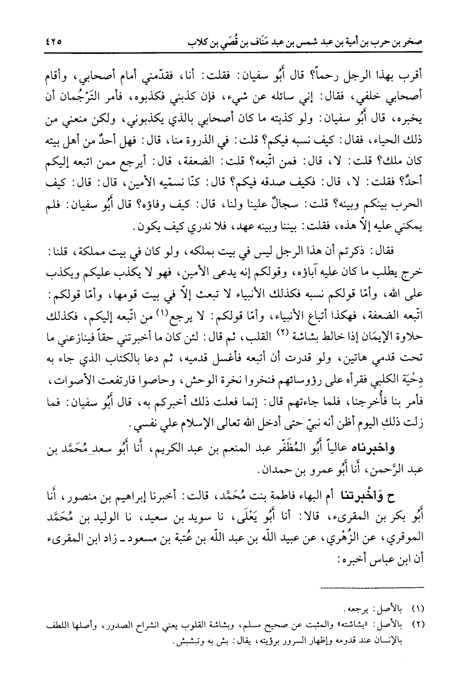 أقرب بهذا الرجل رحما قال أبو سفيان فقلت أنا فقدمني أمام أصحابي وأقام أصحابي خلقي فقال إني سائله عن شئ فإن كذبني فكذبوه فأمر الترجمان أن يخبره قال أبو سفيان ولو كذبته ما كان أصحابي بالذي يكذبوني ولكن منعني من ذلك الحياء فقال كيف نسبه فيكم قلت في الذروة منا قال فهل أحد من أهل بيته كان ملك قلت لا قال فمن اتبعه قلت الضعفة قال أيرجع ممن اتبعه إليكم أحد فقلت لا قال فكيف صدقه فيكم قال كنا نسميه الأمين قال قال كيف الحرب بينكم وبينه قلت سجال علينا ولنا قال كيف وفاؤه قال أبو سفيان فلم يمكني عليه إلا هذه فقلت بيننا وبينه عهد فلا ندري كيف يكون فقال ذكرتم أن هذا الرجل ليس في بيت بملكه ولو كان في بيت مملكة قلنا خرج يطلب ما كان عليه آباؤه وقولكم إنه يدعى الأمين فهو لا يكذب عليكم ويكذب على الله وأما قولكم نسبه فكذلك الأنبياء لا تبعث إلا في بيت قومها وأما قولكم اتبعه الضعفة فهكذا أتباع الأنبياء وأما قولكم لا يرجع (1) من اتبعه إليكم فكذلك حلاوة الإيمان إذا خالط بشاشة (2) القلب ثم قال لئن كان ما أخبرتني حقا فينازعني ما تحت قدمي هاتين ولو قدرت أن أتبعه فأغسل قدميه ثم دعا بالكتاب الذي جاء به دحية الكلبي فقرأه على رؤوسائهم فنخروا نخرة الوحش وحاصوا فارتفعت الأصوات فأمر بنا فأخرجنا فلما جاءتهم قال إنما فعلت ذلك أخبركم به قال أبو سفيان فما زلت ذلك اليوم أظن أنه نبي حتى أدخل الله تعالى الإسلام علي نفسي وأخبرناه عاليا أبو المظفر عبد المنعم بن عبد الكريم أنا أبو سعد محمد بن عبد الرحمن أنا أبو عمرو بن حمدان ح وأخبرتنا أم البهاء فاطمة بنت محمد قالت أخبرنا إبراهيم بن منصور أنا أبو بكر بن المقرئ قالا أنا أبو يعلى نا سويد بن سعيد نا الوليد بن محمد الموقري عن الزهري عن عبيد الله بن عبد الله بن عتبة بن مسعود زاد ابن المقرئ أن ابن عباس أخبره