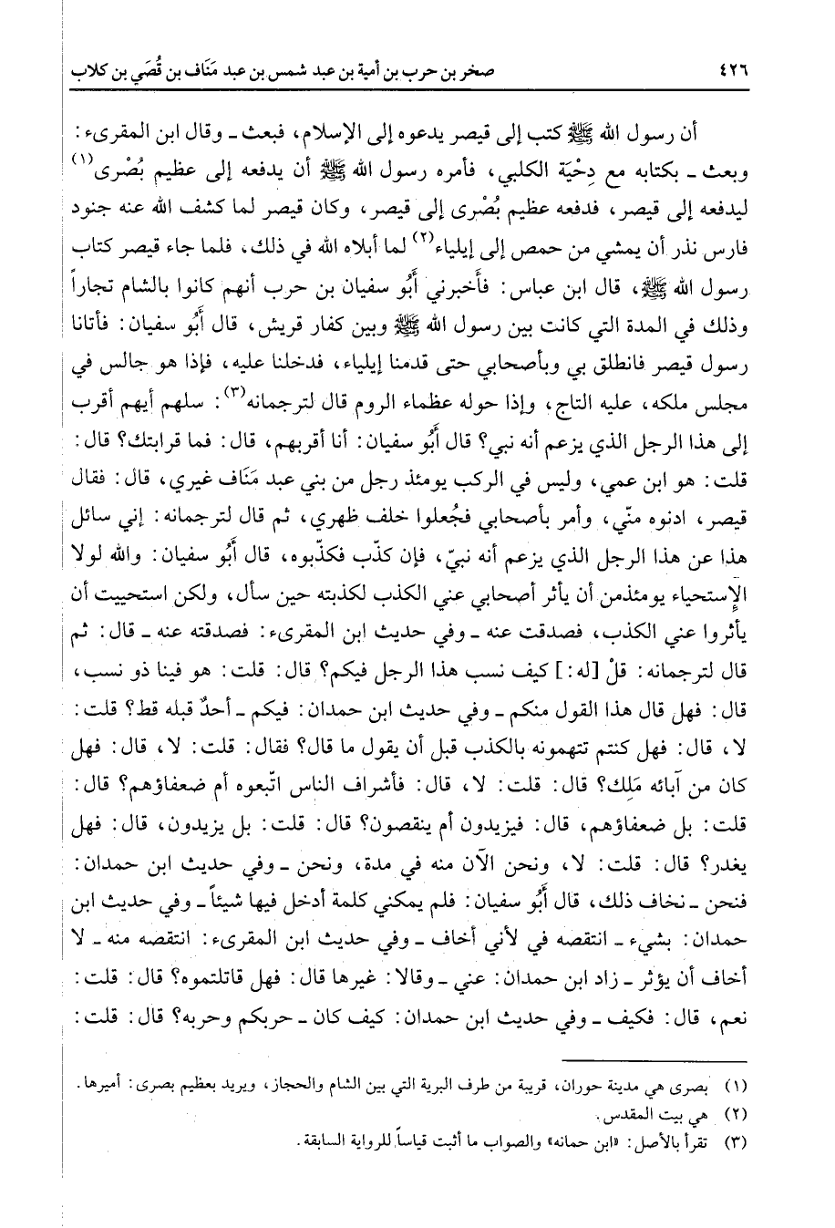 أن رسول الله (صلى الله عليه وسلم) كتب إلى قيصر يدعوه إلى الإسلام فبعث وقال ابن المقرئ وبعث بكتابه مع دحية الكلبي فأمره رسول الله (صلى الله عليه وسلم) أن يدفعه إلى عظيم بصرى (1) ليدفعه إلى قيصر فدفعه عظيم بصرى إلى قيصر وكان قيصر لما كشف الله عنه جنود فارس نذر أن يمشي من حمص إلى إيلياء (2) لما أبلاه الله في ذلك فلما جاء قيصر كتاب رسول الله (صلى الله عليه وسلم) قال ابن عباس فأخبرني أبو سفيان بن حرب أنهم كانوا بالشام تجارا وذلك في المدة التي كانت بين رسول الله (صلى الله عليه وسلم) وبين كفار قريش قال أبو سفيان فأتانا رسول قيصر فانطلق بي وبأصحابي حتى قدمنا إيلياء فدخلنا عليه فإذا هو جالس في مجلس ملكه عليه التاج وإذا حوله عظماء الروم قال لترجمانه (3) سلهم أيهم أقرب إلى هذا الرجل الذي يزعم أنه نبي قال أبو سفيان أنا أقربهم قال فما قرابتك قال قلت هو ابن عمي وليس في الركب يومئذ رجل من بني عبد مناف غيري قال فقال قيصر ادنوه مني وأمر بأصحابي فجعلوا خلف ظهري ثم قال لترجمانه إنيسائل هذا عن هذا الرجل الذي يزعم أنه نبي فإن كذب فكذبوه قال أبو سفيان والله لولا الإستحياء يومئذ من أن يأثر أصحابي عني الكذب لكذبته حين سأل ولكن استحييت أن يأثروا عني الكذب فصدقت عنه وفي حديث ابن المقرئ فصدقته عنه قال ثم قال لترجمانه قل له كيف نسب هذا الرجل فيكم قال قلت هو فينا ذو نسب قال فهل قال هذا القول منكم وفي حديث ابن حمدان فيكم أحد قبله قط قلت لا قال فهل كنتم تتهمونه بالكذب قبل أن يقول ما قال فقال قلت لا قال فهل كان من آبائه ملك قال قلت لا قال فأشراف الناس اتبعوه أم ضعفاؤهم قال قلت بل ضعفاؤهم قال فيزيدون أم ينقصون قال قلت بل يزيدون قال فهل يغدر قال قلت لا ونحن الآن منه في مدة ونحن وفي حديث ابن حمدان فنحن نخاف ذلك قال أبو سفيان فلم يمكني كلمة أدخل فيها شيئا وفي حديث ابن حمدان بشئ انتقصه في لأني أخاف وفي حديث ابن المقرئ انتقصه منه لا أخاف أن يؤثر زاد ابن حمدان عني وقالا غيرها قال فهل قاتلتموه قال قلت نعم قال فكيف وفي حديث ابن حمدان كيف كان حربكم وحربه قال قلت