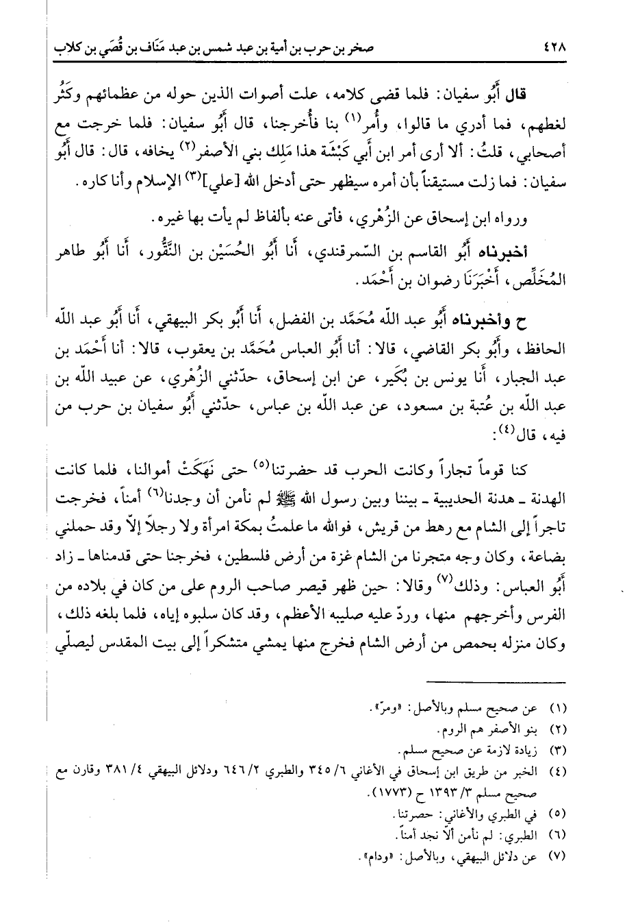 قال أبو سفيان فلما قضى كلامه علت أصوات الذين حوله من عظمائهم وكثر لغطهم فما أدري ما قالوا وأمر (1) بنا فأخرجنا قال أبو سفيان فلما خرجت مع أصحابي قلت ألا أرى أمر ابن أبي كبشة هذا ملك بني الأصفر (2) يخافه قال قال أبو سفيان فما زلت مستيقنا بأن أمره سيظهر حتى أدخل الله علي (3) الإسلام وأنا كاره ورواه ابن إسحاق عن الزهري فأتى عنه بألفاظ لم يأت بها غيره أخبرناه أبو القاسم بن السمرقندي أنا أبو الحسين بن النقور أنا أبو طاهر المخلص أخبرنا رضوان بن أحمد ح وأخبرناه أبو عبد الله محمد بن الفضل أنا أبو بكر البيهقي أنا أبو عبد الله الحافظ وأبو بكر القاضي قالا أنا أبو العباس محمد بن يعقوب قالا أنا أحمد بن عبد الجبار أنا يونس بن بكير عن ابن إسحاق حدثني الزهري عن عبيد الله بن عبد الله بن عتبة بن مسعود عن عبد الله بن عباس حدثني أبو سفيان بن حرب من فيه قال (4) كنا قوما تجارا وكانت الحرب قد حضرتنا (5) حتى نهكت أموالنا فلما كانت الهدنة هدنة الحديبية بيننا وبين رسول الله (صلى الله عليه وسلم) لم نأمن أن وجدنا (6) أمنا فخرجت تاجرا إلى الشام مع رهط من قريش فوالله ما علمت بمكة امرأة ولا رجلا إلا وقد حملني بضاعة وكان وجه متجرنا من الشام غزة من أرض فلسطين فخرجنا حتى قدمناه زاد أبو العباس وذلك (7) وقالا حين ظهر قيصر صاحب الروم على من كان في بلاده من الفرس وأخرجهم منها ورد عليه صليبه الأعظم وقد كان سلبوه إياه فلما بلغه ذلك وكان منزله بحمص من أرض الشام فخرج منها يمشي متشكرا إلى بيت المقدس ليصلي