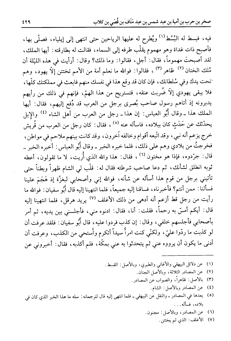 فيه فبسط له البسط (1) ويطرح له عليها الرياحين حين انتهى إلى إيلياء فصلى بها فأصبح ذات غداة وهو مهموم يقلب طرفه إلى السماء فقالت له بطارقته أيها الملك لقد أصبحت مهموما فقال أجل فقالوا وما ذلك وقال أرأيت في هذه الليلة أن ملك الختان (2) ظاهر (3) فقالوا فوالله ما نعلم أمة من الأمم تختتن إلا يهود وهم تحت يدك وفي سلطانك فإن كان قد وقع هذا في نفسك منهم فابعث في مملكتك كلها فلا يبقى يهودي إلا ضربت عنقه فتستريح من هذا الهم فإنهم في ذلك من رأيهم يدبرونه إذ أتاهم رسول صاحب بصرى برجل من العرب قد دفع إليهم فقال أيها الملك هذا وقال أبو العباس إن هذا رجل من العرب من أهل الشاء (4) والإبل يحدثك عن حدث كان ببلاده فاسأله عنه (5) فقال كان رجل من العرب من قريش خرج يزعم أنه نبي وقد اتبعه أقوام وخالفه آخرون وقد كانت بينهم ملاحم في مواطن فخرجت من بلادي وهم على ذلك فلما خبره الخبر وقال أبو العباس أخبره الخبر قال جردوه فإذا هو مختون (6) فقال هذا والله الذي أريت لا ما تقولون أعطه ثوبه انطلق لشأنك ثم دعا صاحب شرطته فقال له قلب لي الشام ظهرا وبطنا حتى تأتيني برجل من قوم هذا أسأله عن شأنه فوالله إني وأصحابي لبغزة إذ هجم علينا فسألنا ممن أنتم فأخبرناه فساقنا إليه جميعا فلما انتهينا إليه قال أبو سفيان فوالله ما رأيت من رجل قط أزعم أنه أدهى من ذلك الأغلف (7) يريد هرقل فلما انتهينا إليه قال أيكم أمس به رحما فقلت أنا فقال ادنوه مني فأجلسني بين يديه ثم أمر بأصحابي فأجلسهم خلفي وقال إن كذب فردوا عليه قال أبو سفيان فلقد عرفت أن لو كذبت ما ردوا علي ولكني كنت امرأ سيدا أتكرم وأستحي من الكذب وعرفت أن أدنى ما يكون أن يرووه عني ثم يتحدثوا به عني بمكة فلم أكذبه فقال أخبروني عن