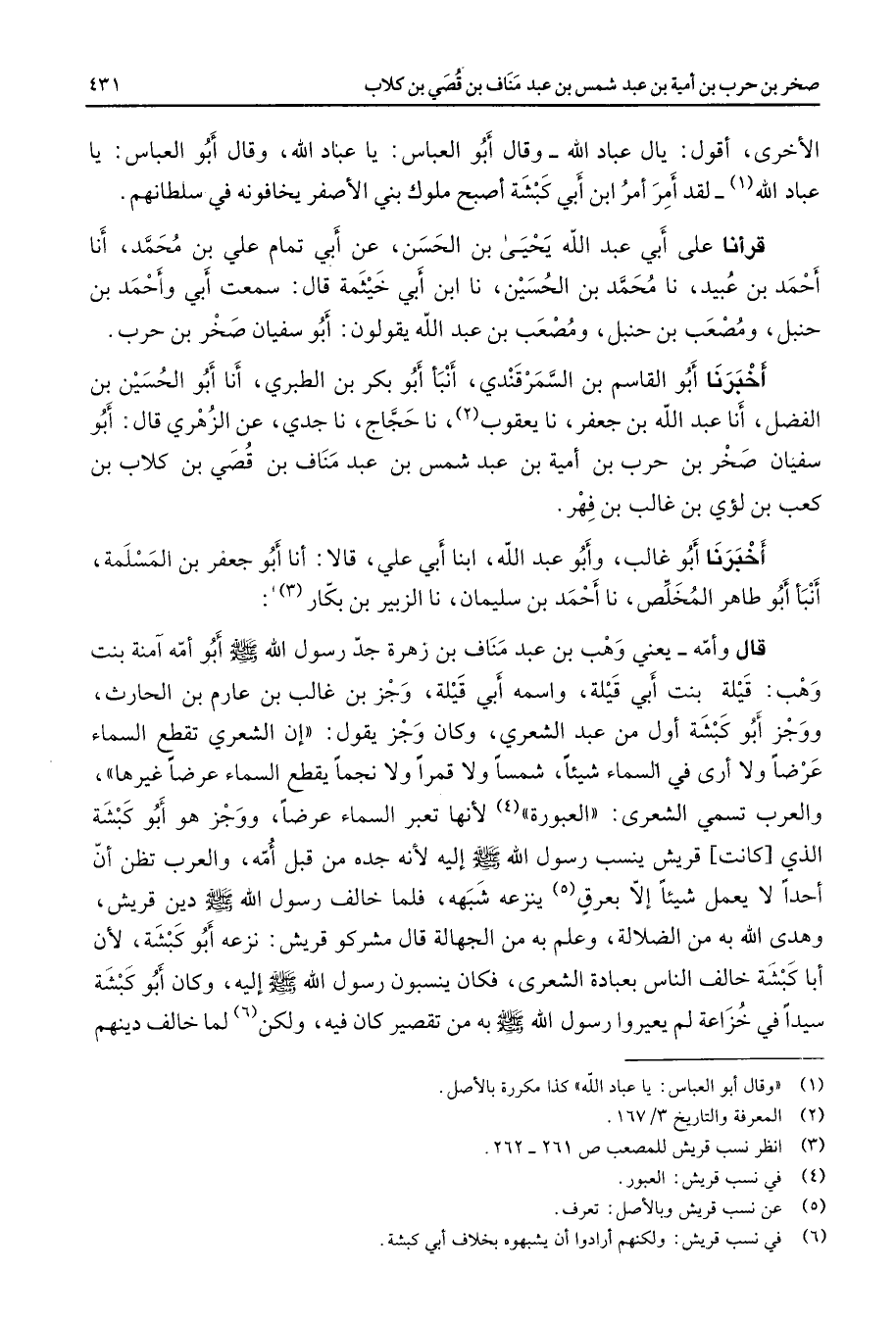 الأخرى أقول يال عباد الله وقال أبو العباس يا عباد الله وقال أبو العباس يا عباد الله (1) لقد أمر أمر ابن أبي كبشة أصبح ملوك بني الأصفر يخافونه في سلطانهم قرأنا على أبي عبد الله يحيى بن الحسن عن أبي تمام علي بن محمد أنا أحمد بن عبيد نا محمد بن الحسين نا ابن أبي خيثمة قال سمعت أبي وأحمد بن حنبل ومصعب بن حنبل ومصعب بن عبد الله يقولون أبو سفيان صخر بن حرب أخبرنا أبو القاسم بن السمرقندي أنبأ أبو بكر بن الطبري أنا أبو الحسين بن الفضل أنا عبد الله بن جعفر نا يعقوب (2) نا حجاج نا جدي عن الزهري قال أبو سفيان صخر بن حرب بن أمية بن عبد شمس بن عبد مناف بن قصي بن كلاب بن كعب بن لؤي بن غالب بن فهر أخبرنا أبو غالب وأبو عبد الله ابنا أبي علي قالا أنا أبو جعفر بن المسلمة أنبأ أبو طاهر المخلص نا أحمد بن سليمان نا الزبير بن بكار (3) قال وأمه يعني وهب بن عبد مناف بن زهرة جد رسول الله (صلى الله عليه وسلم) أبو أمه آمنة بنت وهب قيلة بنت أبي قيلة واسمه أبي قيلة وجز بن غالب بن عارم بن الحارث ووجز أبو كبشة أول من عبد الشعري وكان وجز يقول إن الشعري تقطع السماء عرضا ولا أرى في السماء شيئا شمسا ولا قمرا ولا نجما يقطع السماء عرضا غيرها والعرب تسمي الشعرى العبورة (4) لأنها تعبر السماء عرضا ووجز هو أبو كبشة الذي كانت قريش ينسب رسول الله (صلى الله عليه وسلم) إليه لأنه جده من قبل أمه والعرب تظن أن أحدا لا يعمل شيئا إلا بعرق (5) ينزعه شبهه فلما خالف رسول الله (صلى الله عليه وسلم) دين قريش وهدى الله به من الضلالة وعلم به من الجهالة قال مشركو قريش نزعه أبو كبشة لأن أبا كبشة خالف الناس بعبادة الشعرى فكان ينسبون رسول الله (صلى الله عليه وسلم) إليه وكان أبو كبشة سيدا في خزاعة لم يعيروا رسول الله (صلى الله عليه وسلم) به من تقصير كان فيه ولكن (6) لما خالف دينهم