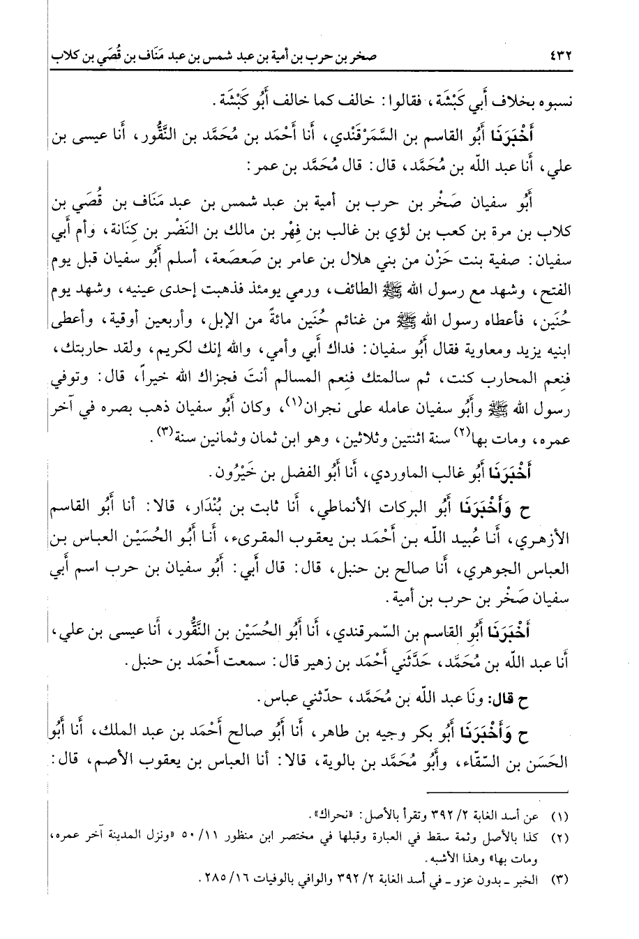نسبوه بخلاف أبي كبشة فقالوا خالف كما خالف أبو كبشة أخبرنا أبو القاسم بن السمرقندي أنا أحمد بن محمد بن النقور أنا عيسى بن علي أنا عبد الله بن محمد قال قال محمد بن عمر أبو سفيان صخر بن حرب بن أمية بن عبد شمس بن عبد مناف بن قصي بن كلاب بن مرة بن كعب بن لؤي بن غالب بن فهر بن مالك بن النضر بن كنانة وأم أبي سفيان صفية بنت حزن من بني هلال بن عامر بن صعصعة أسلم أبو سفيان قبل يوم الفتح وشهد مع رسول الله (صلى الله عليه وسلم) الطائف ورمي يومئذ فذهبت إحدى عينيه وشهد يوم حنين فأعطاه رسول الله (صلى الله عليه وسلم) من غنائم حنين مائة من الإبل وأربعين أوقية وأعطى أبنيه يزيد ومعاوية فقال أبو سفيان فداك أبي وأمي والله إنك لكريم ولقد حاربتك فنعم المحارب كنت ثم سالمتك فنعم المسالم أنت فجزاك الله خيرا قال وتوفي رسول الله (صلى الله عليه وسلم) وأبو سفيان عامله على نجران (1) وكان أبو سفيان ذهب بصره في آخر عمره ومات بها (2) سنة اثنتين وثلاثين وهو ابن ثمان وثمانين سنة (3) أخبرنا أبو غالب الماوردي أنا أبو الفضل بن خيرون ح وأخبرنا أبو البركات الأنماطي أنا ثابت بن بندار قالا أنا أبو القاسم الأزهري أنا عبيد الله بن أحمد بن يعقوب المقرئ أنا أبو الحسين العباس بن العباس الجوهري أنا صالح بن حنبل قال قال أبي أبو سفيان بن حرب اسم أبي سفيان صخر بن حرب بن أمية أخبرنا أبو القاسم بن السمرقندي أنا أبو الحسين بن النقور أنا عيسى بن علي أنا عبد الله بن محمد حدثني أحمد بن زهير قال سمعت أحمد بن حنبل ح قال ونا عبد الله بن محمد حدثني عباس ح وأخبرنا أبو بكر وجيه بن طاهر أنا أبو صالح أحمد بن عبد الملك أنا أبو الحسن بن السقاء وأبو محمد بن بالوية قالا أنا العباس بن يعقوب الأصم قال