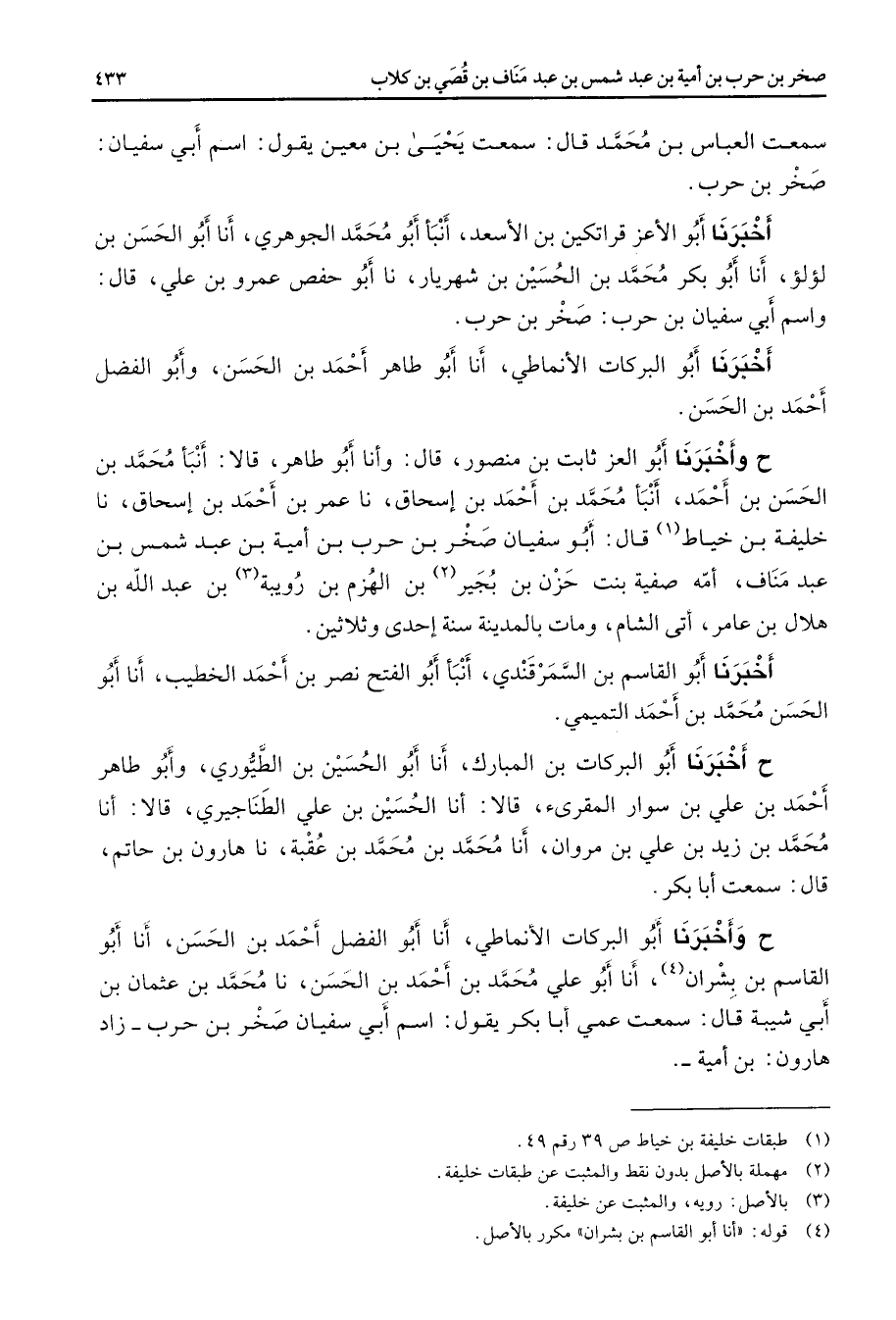 سمعت العباس بن محمد قال سمعت يحيى بن معين يقول اسم أبي سفيان صخر بن حرب أخبرنا أبو الأعز قراتكين بن الأسعد أنبأ أبو محمد الجوهري أنا أبو الحسن بن لؤلؤ أنا أبو بكر محمد بن الحسين بن شهريار نا أبو حفص عمرو بن علي قال واسم أبي سفيان بن حرب صخر بن حرب أخبرنا أبو البركات الأنماطي أنا أبو طاهر أحمد بن الحسن وأبو الفضل أحمد بن الحسن ح وأخبرنا أبو العز ثابت بن منصور قال وأنا أبو طاهر قالا أنبأ محمد بن الحسن بن أحمد أنبأ محمد بن أحمد بن إسحاق نا عمر بن أحمد بن إسحاق نا خليفة بن خياط (1) قال أبو سفيان صخر بن حرب بن أمية بن عبد شمس بن عبد مناف أمه صفية بنت حزن بن بجير (2) بن الهزم بن رويبة (3) بن عبد الله بن هلال بن عامر أتى الشام ومات بالمدينة سنة إحدى وثلاثين أخبرنا أبو القاسم بن السمرقندي أنبأ أبو الفتح نصر بن أحمد الخطيب أنا أبو الحسن محمد بن أحمد التميمي ح أخبرنا أبو البركات بن المبارك أنا أبو الحسين بن الطيوري وأبو طاهر أحمد بن علي بن سوار المقرئ قالا أنا الحسين بن علي الطناجيري قالا أنا محمد بن زيد بن علي بن مروان أنا محمد بن محمد بن عقبة نا هارون بن حاتم قال سمعت أبا بكر ح وأخبرنا أبو البركات الأنماطي أنا أبو الفضل أحمد بن الحسن أنا أبو القاسم بن بشران (4) أنا أبو علي محمد بن أحمد بن الحسن نا محمد بن عثمان بن أبي شيبة قال سمعت عمي أبا بكر يقول اسم أبي سفيان صخر بن حرب زاد هارون بن أمية