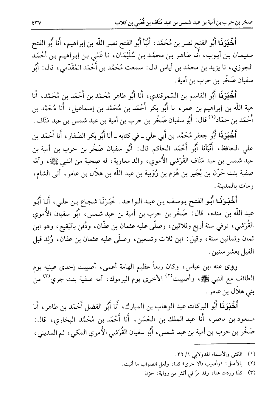 سفيان صخر بن حرب بن أمية أخبرنا أبو القاسم بن السمرقندي أنا أبو طاهر محمد بن أحمد بن محمد أنا هبة الله بن إبراهيم بن عمر نا أبو بكر أحمد بن محمد بن إسماعيل أنا محمد بن أحمد بن حماد (1) قال أبو سفيان صخر بن حرب بنأمية بن عبد شمس بن عبد مناف أخبرنا أبو جعفر محمد بنأبي علي في كتابه أنا أبو بكر الصفار أنا أحمد بن علي الحافظ أنبأنا أبو أحمد الحاكم قال أبو سفيان صخر بن حرب بن أمية بن عبد شمس بن عبد مناف القرشي الأموي والد معاوية له صحبة من النبي (صلى الله عليه وسلم) وأمه صفية بنت حزن بن بجير بن هزم بن رويبة بن عبد الله بن هلال بن عامر أتى الشام ومات بالمدينة أخبرنا أبو الفتح يوسف بن عبد الواحد خبرنا شجاع بن علي أنا أبو عبد الله بن منده قال صخر بن حرب بن أمية بن عبد شمس أبو سفيان الأموي القرشي توفي سنة أربع وثلاثين وصلى عليه عثمان بن عفان ودفن بالبقيع وهو ابن ثمان وثمانين سنة وقيل ابن ثلاث وتسعين وصلى عليه عثمان بن عفان ولد قبل الفيل بعشر سنين روى عنه ابن عباس وكان ربعا عظيم الهامة أعمى أصيبت إحدى عينيه يوم الطائف مع النبي (صلى الله عليه وسلم) وأصيبت (2) الأخرى يوم اليرموك أمه صفية بنت جري (3) من بني هلال بن عامر أخبرنا أبو البركات عبد الوهاب بن المبارك أنا أبو الفضل أحمد بن طاهر أنا مسعود بن ناصر أنا عبد الملك بن الحسن أنا أحمد بن محمد البخاري قال صخر بن حرب بن أمية بن عبد شمس أبو سفيان القرشي الأموي المكي ثم المديني