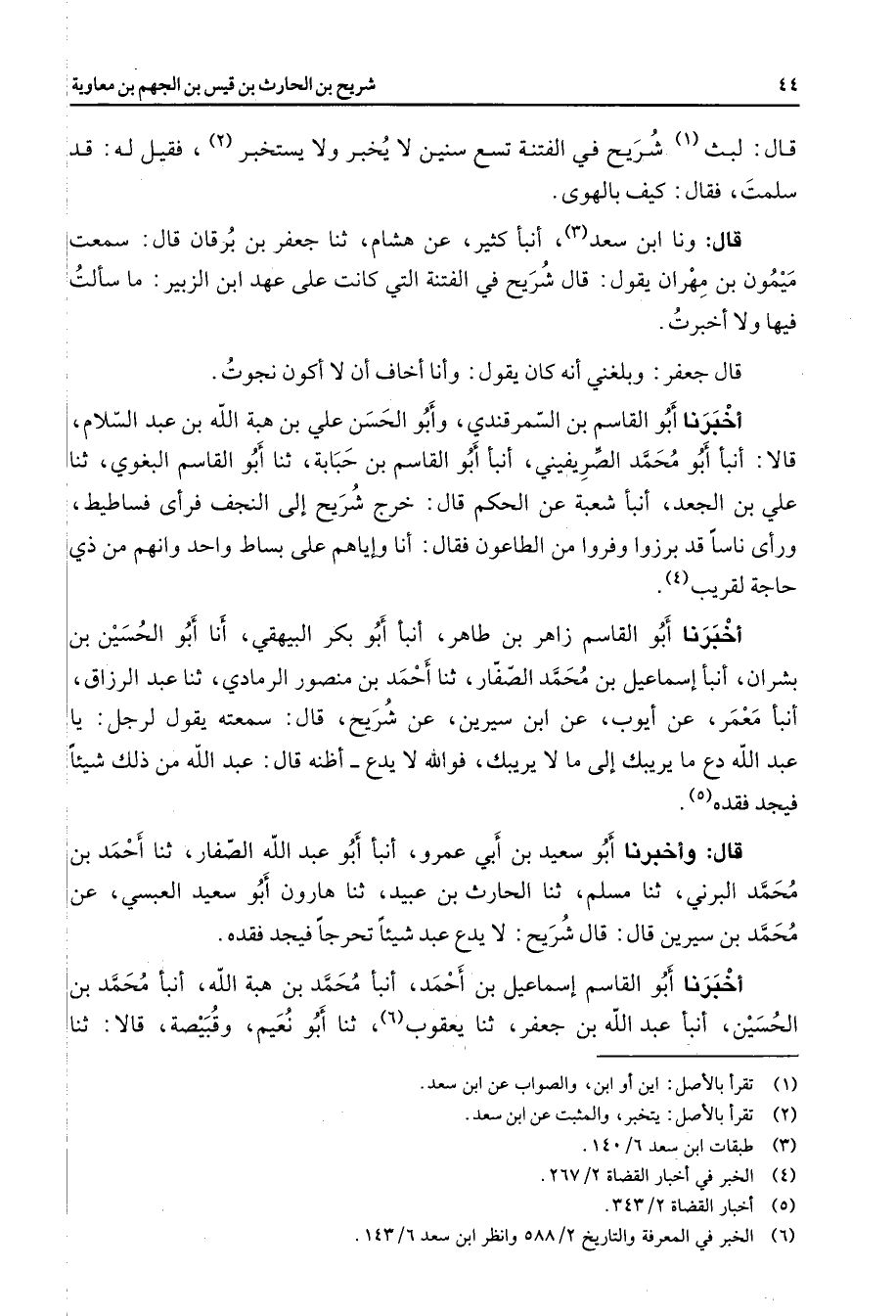 قال ليث (1) شريح في الفتنة تسع سنين لا يخبر ولا يستخبر (2) فقيل له قد سلمت فقال كيف بالهوى قال ونا ابن سعد (3) أنبأ كثير عن هشام ثنا جعفر بن برقان قال سمعت ميمون بن مهران يقول قال شريح في الفتنة التي كانت على عهد ابن الزبير ما سألت فيها ولا أخبرت قال جعفر وبلغني أنه كان يقول وأنا أخاف أن لا أكون نجوت أخبرنا أبو القاسم بن السمرقندي وأبو الحسن علي بن هبة الله بن عبد السلام قالا أنبأ أبو محمد الصريفيني أنبأ أبو القاسم بن حبابة ثنا أبو القاسم البغوي ثنا علي بن الجعد أنبأ شعبة عن الحكم قال خرج شريح إلى النجف فرأى فساطيط ورأى ناسا قد برزوا وفروا من الطاعون فقال أنا وإياهم على بساط واحد وانهم من ذي حاجة لقريب (4) أخبرنا أبو القاسم زاهر بن طاهر أنبأ أبو بكر البيهقي أنا أبو الحسين بن بشران أنبأ إسماعيل بن محمد الصفار ثنا أحمد بن منصور الرمادي ثنا عبد الرزاق أنبأ معمر عن أيوب عن ابن سيرين عن شريح قال سمعته يقول لرجل يا عبد الله دع ما يريبك إلى ما لا يريبك فوالله لا يدع أظنه قال عبد الله من ذلك شيئا فيجد فقده قال وأخبرنا أبو سعيد بن أبي عمرو أنبأ أبو عبد الله الصفار ثنا أحمد بن محمد البرني ثنا مسلم ثنا الحارث بن عبيد ثنا هارون أبو سعيد العبسي عن محمد بن سيرين قال قال شريح لا يدع عبد شيئا تحرجا فيجد فقده أخبرنا أبو القاسم إسماعيل بن أحمد أنبأ محمد بن هبة الله أنبأ محمد بن الحسين أنبأ عبد الله بن جعفر ثنا يعقوب (6) ثنا أبو نعيم وقبيصة قالا ثنا
