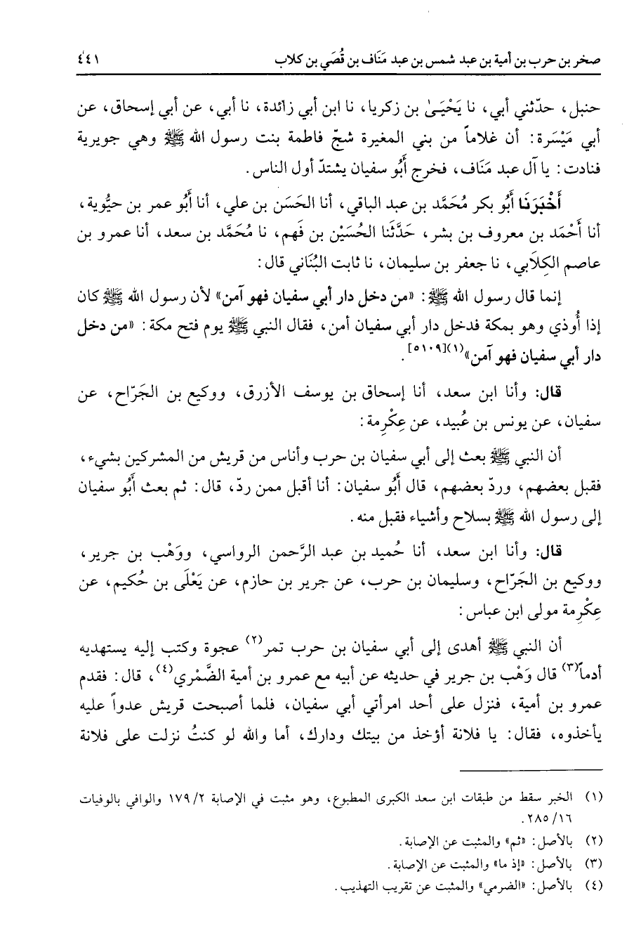 حنبل حدثني أبي نا يحيى بن زكريا نا ابن أبي زائدة نا أبي عن أبي إسحاق عن أبي ميسرة أن غلاما من بني المغيرة شج فاطمة بنت رسول الله (صلى الله عليه وسلم) وهي جويرية فنادت يا آل عبد مناف فخرج أبو سفيان يشتد أول الناس أخبرنا أبو بكر محمد بن عبد الباقي أنا الحسن بن علي أنا أبو عمر بن حيوية أنا أحمد بن معروف بن بشر حدثنا الحسين بن فهم نا محمد بن سعد أنا عمرو بن عاصم الكلابي نا جعفر بن سليمان نا ثابت البناني قال إنما قال رسول الله (صلى الله عليه وسلم) من دخل دار أبي سفيان فهو آمن لأن رسول الله (صلى الله عليه وسلم) كان إذا أوذي وهو بمكة فدخل دار أبي سفيان أمن فقال النبي (صلى الله عليه وسلم) يوم فتح مكة من دخل دار أبي سفيان فهو آمن (1) قال وأنا ابن سعد أنا إسحاق بن يوسف الأزرق ووكيع بن الجراح عن سفيان عن يونس بن عبيد عن عكرمة أن النبي (صلى الله عليه وسلم) بعث إلى أبي سفيان بن حرب وأناس من قريش من المشركين بشئ فقبل بعضهم ورد بعضهم قال أبو سفيان أنا أقبل ممن رد قال ثم بعث أبو سفيان إلى رسول الله (صلى الله عليه وسلم) بسلاح وأشياء فقبل منه قال وأنا ابن سعد أنا حميد بن عبد الرحمن الرواسي ووهب بن جرير ووكيع بن الجراح وسليمان بن حرب عن جرير بن حازم عن يعلى بن حكيم عن