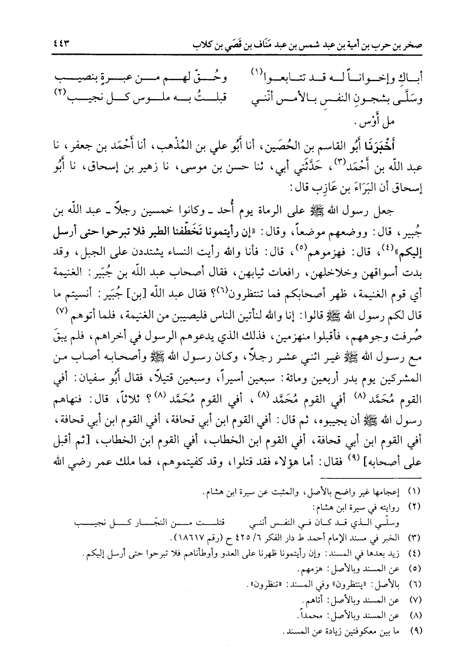 (2) روايته في سيرة ابن هشام: وسلي الذي قد كان في النفس أنني * قتلت من النجار كل نجيب (3) الخبر في المسند الإمام أحمد ط دار الفكر 6 / 425 ح (رقم 18617)