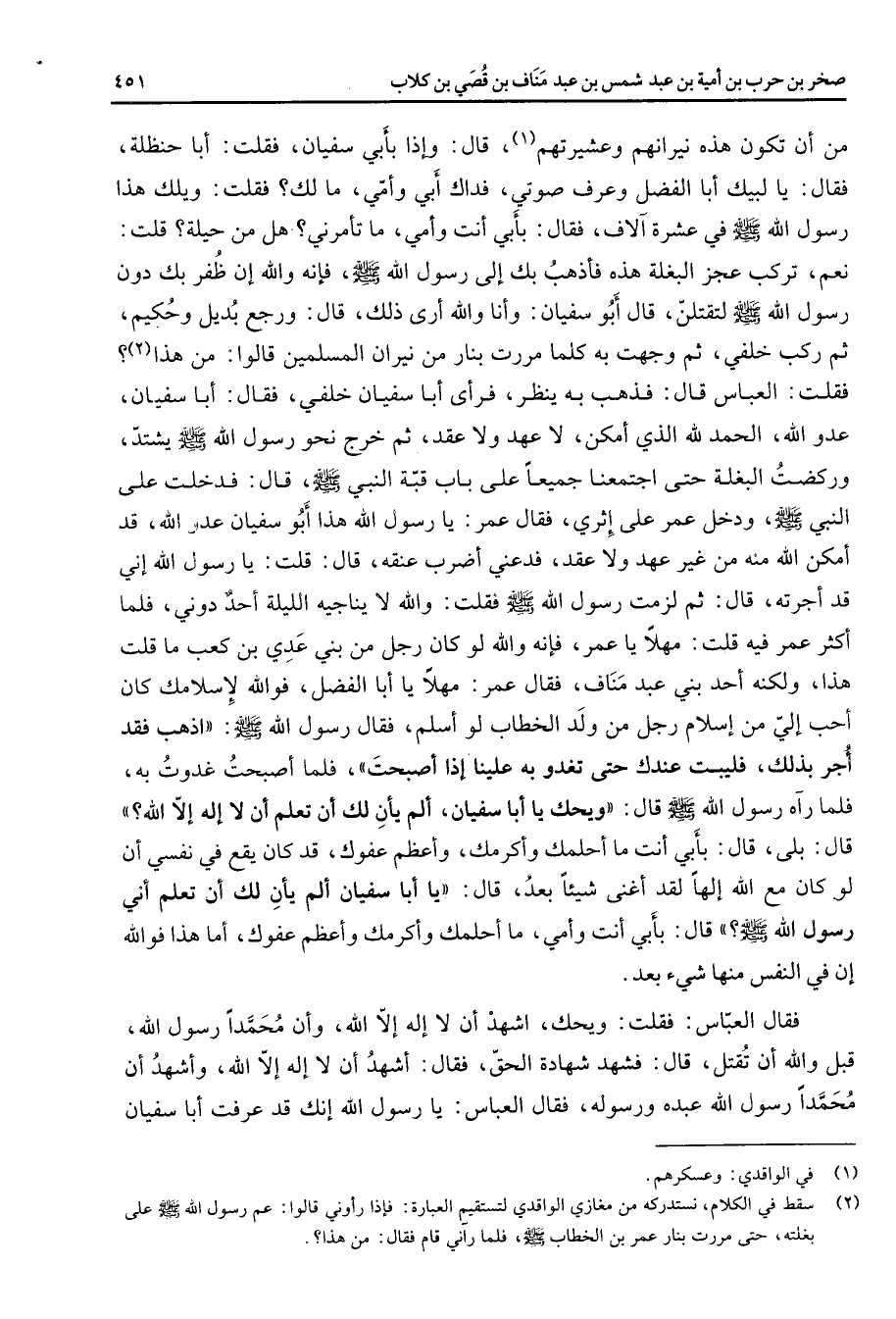 من أن تكون هذه نيرانهم وعشيرتهم (1) قال وإذا بأبي سفيان فقلت أبا حنظلة فقال يا لبيك أبا الفضل وعرف صوتي فداك أبي وأمي ما لك فقلت ويلك هذا رسول الله (صلى الله عليه وسلم) في عشرة آلاف فقال بأبي أنت وأمي ما تأمرني هل من حيلة قلت نعم تركب عجز البغلة هذه فأذهب بك إلى رسول الله (صلى الله عليه وسلم) فإنه والله إن ظفر بك دون رسول الله (صلى الله عليه وسلم) لتقتلن قال أبو سفيان وأنا والله أرى ذلك قال ورجع بديل وحكيم ثم ركب خلفي ثم وجهت به كلما مررت بنار من نيران المسلمين قالوا من هذا (2) فقلت العباس قال فذهب به ينظر فرأى أبا سفيان خلفي فقال أبا سفيان عدو الله الحمد لله الذي أمكن لا عهد ولا عقد ثم خرج نحو رسول الله (صلى الله عليه وسلم) يشتد وركضت البغلة حتى اجتمعنا جميعا على باب قبة النبي (صلى الله عليه وسلم) قال فدخلت على النبي (صلى الله عليه وسلم) ودخل عمر إلى إثري فقال عمر يا رسول الله هذا أبو سفيان عدو الله قد أمكن الله منه من غير عهد ولا عقد فدعني أضرب عنقه قال قلت يا رسول الله إني قد أجرته قال ثم لزمت رسول الله (صلى الله عليه وسلم) فقلت والله لا يناجيه الليلة أحد دوني فلما أكثر عمر فيه قلت مهلا يا عمر فإنه والله لو كان رجل من بني عدي بن كعب ما قلت هذا ولكنه أحد بني عبد مناف فقال عمر مهلا يا أبا الفضل فوالله لإسلامك كان أحب إلي من إسلام رجل من ولد لخطاب لو أسلم فقال رسول الله (صلى الله عليه وسلم) اذهب فقد أجر بذلك فليبت عندك حتى تغدو به علينا إذا أصبحت فلما أصبحت غدوت به فلما رآه رسول الله (صلى الله عليه وسلم) قال ويحك يا أبا سفيان ألم يأن لك أن تعلم أن لا إله إلا الله قال بلى قال بأبي أنت وأمي ما أحلمك وأكرمك وأعظم عفوك قد كان يقع في نفسي أن لو كان مع الله إلها لقد أغنى شيئا بعد قال يا أبا سفيان ألم يأن لك أن تعلم أني رسول الله (صلى الله عليه وسلم) قال بأبي أنت وأمي ما أحلمك وأكرمك وأعظم عفوك أما هذا فوالله إن في النفس منها شئ بعد فقال العباس فقلت ويحك اشهد أن لا إله إلا الله وأن محمدا رسول الله قبل والله أن تقتل قال فشهد شهادة الحق فقال أشهد أن لا إله إلا الله وأشهد أن محمدا رسول الله عبده ورسوله فقال العباس يا رسول الله إنك قد عرفت أبا سفيان