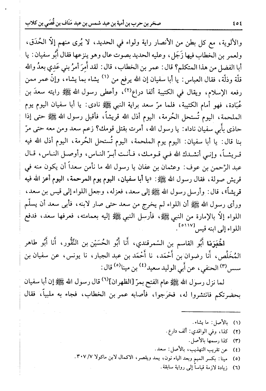 والألوية مع كل بطن من الأنصار راية ولواء في الحديد لا يرى منهم إلا الحدق ولعمر بن الخطاب فيها زجل وعليه الحديد بصوت عال وهو ينزعها فقال أبو سفيان يا أبا الفضل من هذا المتكلم قال عمر بن الخطاب قال لقد أمر أمر بني عدي بعد والله قلة وذلة فقال العباس يا أبا سفيان إن الله يرفع من (1) يشاء بما يشاء وإن عمر ممن رفعه الإسلام ويقال في الكتيبة ألفا دراع (2) وأعطى رسول الله (صلى الله عليه وسلم) رايته سعد بن عبادة فهو أمام الكتيبة فلما مر سعد براية النبي (صلى الله عليه وسلم) نادى يا أبا سفيان اليوم يوم المرحمة اليوم تستحل الحرمة اليوم أذل الله قريشا فأقبل رسول الله (صلى الله عليه وسلم) حتى إذا حاذى بأبي سفيان ناداه يا رسول الله أمرت بقتل قومك زعم سعد ومن معه حتى مر بنا قال يا أبا سفيان اليوم يوم الملحمة اليوم تستحل الحرمة اليوم أذل الله فيه قريشا وإني أنشدك الله في قومك فأنت أبر الناس وأوصل الناس قال عبد الرحمن بن عوف وعثمان بن عفان يا رسول الله ما نأمن سعدا أن يكون منه في قريش صولة فقال رسول الله (صلى الله عليه وسلم) يا أبا سفيان اليوم يوم الملحمة اليوم أعز الله فيه قريشا قال وأرسل رسول الله (صلى الله عليه وسلم) إلى سعد فعزله وجعل اللواء إلى قيس بن سعد ورأى رسول الله (صلى الله عليه وسلم) أن اللواء لم يخرج من سعد حتى صار لابنه فأبى سعد أن يسلم اللواء إلا بالإمارة من النبي (صلى الله عليه وسلم) فأرسل النبي (صلى الله عليه وسلم) إليه بعمامته فعرفها سعد فدفع اللواء إلى ابنه قيس أخبرنا أبو القاسم بن السمرقندي أنا أبو الحسين بن النقور أنا أبو طاهر المخلص أنا رضوان بن أحمد نا أحمد بن عبد الجبار نا يونس عن سفيان بن سس (3) الحنفي عن أبي الوليد سعيد (4) بن مينا (5) قال لما نزل رسول الله (صلى الله عليه وسلم) عام الفتح بمر الظهران (6) قال رسول الله (صلى الله عليه وسلم) إن أبا سفيان بحضرتكم فانتشروا له فخرجوا فأصابه عمر بن الخطاب فجاء به ملبيا فقال