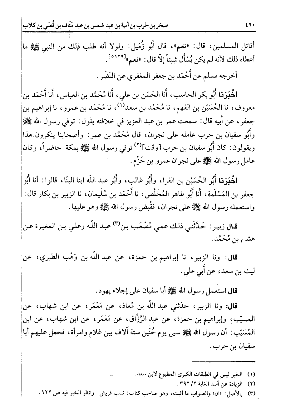 أقاتل المسلمين قال نعم قال أبو زميل ولولا أنه طلب ذلك من النبي (صلى الله عليه وسلم) ما أعطاه ذلك لأنه لم يكن يسأل شيئا إلا قال نعم أخرجه مسلم عن أحمد بن جعفر المغفري عن النضر أخبرنا أبو بكر الحاسب أنا الحسن بن علي أنا محمد بن العباس أنا أحمد بن معروف نا الحسين بن الفهم نا محمد بن سعد (1) نا محمد بن عمرو نا إبراهيم بن جعفر عن أبيه قال سمعت عمر بن عبد العزيز في خلافته يقول توفي رسول الله (صلى الله عليه وسلم) وأبو سفيان بن حرب عامله على نجران قال محمد بن عمر وأصحابنا ينكرون هذا ويقولون كان أبو سفيان بن حرب وقت (2) توفي رسول الله (صلى الله عليه وسلم) بمكة حاضرا وكان عامل رسول الله (صلى الله عليه وسلم) على نجران عمرو بن حزم أخبرنا أبو الحسين بن الفرا وأبو غالب وأبو عبد الله ابنا البنا قالوا أنا أبو جعفر بن المسلمة أنا أبو طاهر المخلص نا أحمد بن سليمان نا الزبير بن بكار قال واستعمله رسول الله (صلى الله عليه وسلم) على نجران فقبض رسول الله (صلى الله عليه وسلم) وهو عليها قال زبير حدثني ذلك عمي مصعب بن (3) عبد الله وعلي بن المغيرة عن هشام بن محمد قال ونا الزبير نا إبراهيم بن حمزة عن عبد الله بن وهب الطبري عن ليث بن سعد عن أبي علي قال استعمل رسول الله (صلى الله عليه وسلم) أبا سفيان على إجلاء يهود قال ونا الزبير حدثني عبد الله بن معاذ عن معمر عن ابن شهاب عن المسيب وإبراهيم بن حمزة عن عبد الرزاق عن معمر عن ابن شهاب عن ابن المسيب أن رسول الله (صلى الله عليه وسلم) سبى يوم حنين ستة آلاف بين غلام وامرأة فجعل عليهم أبا سفيان بن حرب