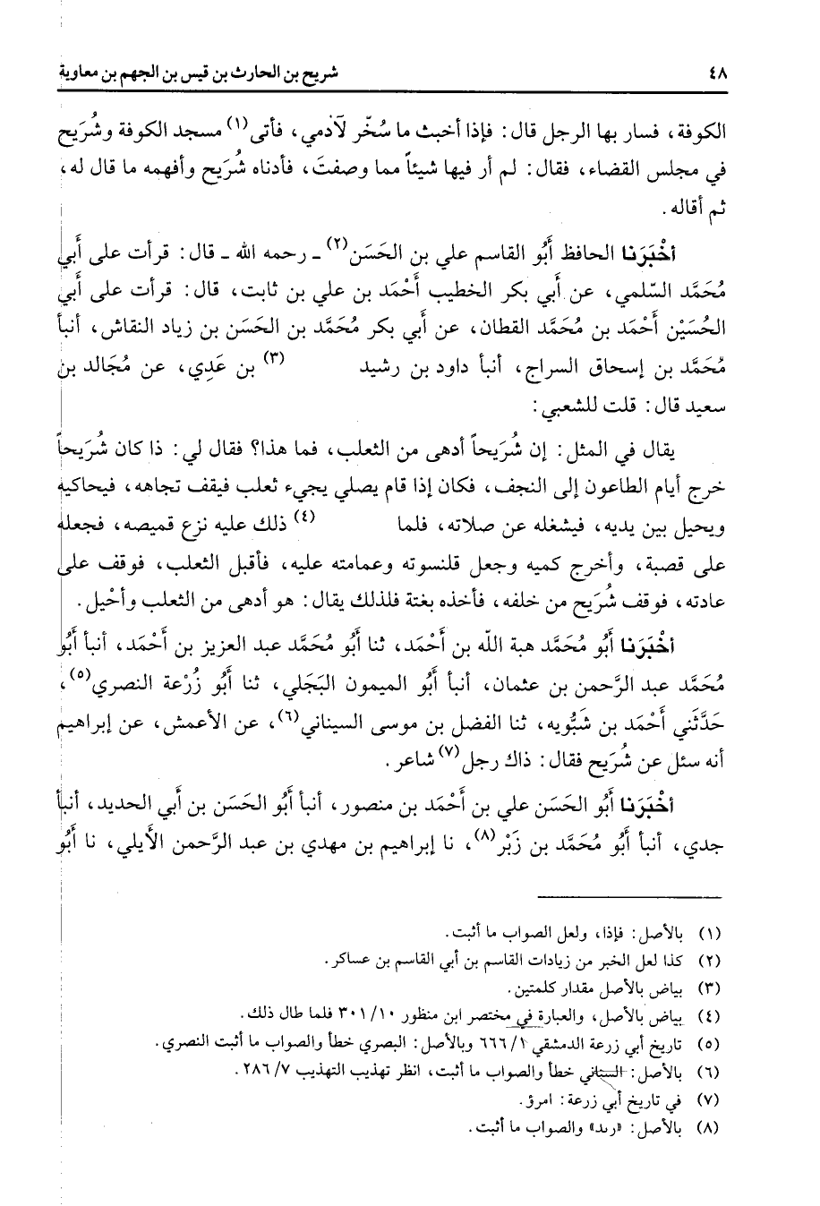 الكوفة فسار بها الرجل قال فإذا أخبث ما سخر لآدمي فأتى (1) مسجد الكوفة وشريح في مجلس القضاء فقال لم أر فيها شيئا مما وصفت فأدناه شريح وأفهمه ما قال له ثم أقاله أخبرنا الحافظ أبو القاسم علي بن الحسن (2) رحمه الله قال قرأت على أبي محمد السلمي عن أبي بكر الخطيب أحمد بن علي بن ثابت قال قرأت على أبي الحسين أحمد بن محمد القطان عنأبي بكر محمد بن الحسن بن زياد النقاش أنبأ محمد بن إسحاق السراج أنبأ داود بن رشيد (3) بن عدي عن مجالد بن سعيد قال قلت للشعبي يقال في المثل إن شريحا أدهى من الثعلب فما هذا فقال لي ذا كان شريحا خرج أيام الطاعون إلى النجف فكان إذا قام يصلي يجئ ثعلب فيقف تجاهه فيحاكيه ويحيل بين يديه فيشغله عن صلاته فلما (4) ذلك عليه نزع قميصه فجعله على قصبة وأخرج كميه وجعل قلنسوته وعمامته عليه فأقبل الثعلب فوقف على عادته فوقف شريح من خلفه فأخذه بغتة فلذلك يقال هو أدهى من الثعلب وأحيل أخبرنا أبو محمد هبة الله بن أحمد ثنا أبو محمد عبد العزيز بن أحمد أنبأ أبو محمد عبد الرحمن بن عثمان أنبأ أبو الميمون البجلي ثنا أبو زرعة النصري (5) حدثني أحمد بن شبويه ثنا الفضل بن موسى السيناني عن الأعمش عن إبراهيم أنه سئل عن شريح فقال ذاك رجل (7) شاعر أخبرنا أبو الحسن علي بن أحمد بن منصور أنبأ أبو الحسن بن أبي الحديد أنبأ جدي أنبأ أبو محمد بن زبر (8) نا إبراهيم بن مهدي بن عبد الرحمن الأيلي نا أبو