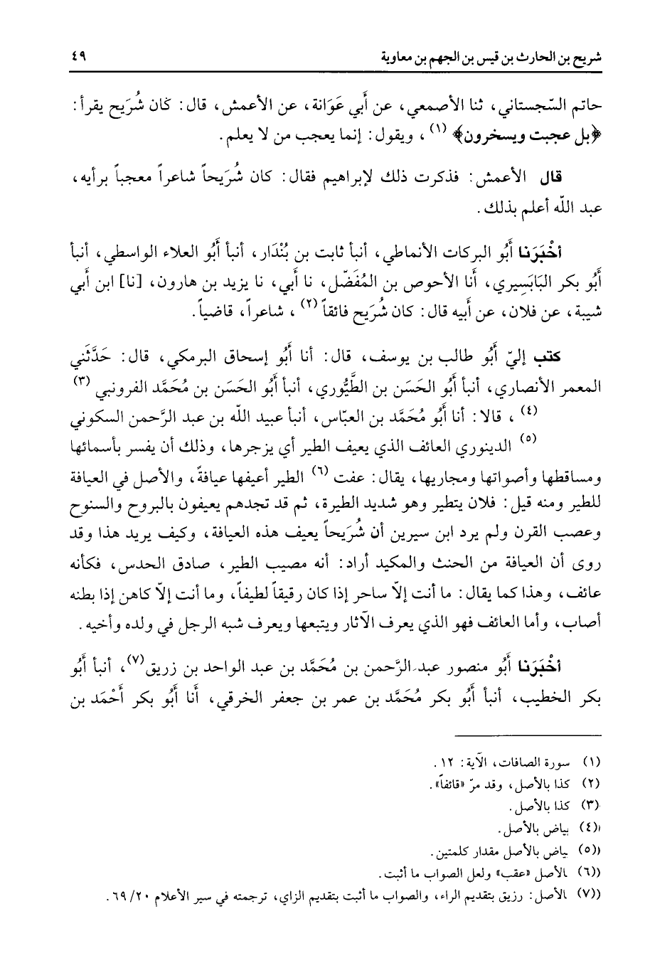 حاتم السجستاني ثنا الأصمعي عنأبي عوانة عن الأعمش قال كان شريح يقرأ " بل عجبت ويسخرون " (1) ويقول إنما يعجب من لا يعلم قال الأعمش فذكرت ذلك لإبراهيم فقال كان شريحا شاعرا معجبا برأيه عبد الله أعلم بذلك أخبرنا أبو البركات الأنماطي أنبأ ثابت بن بندار أنبأ أبو العلاء الواسطي أنبأ أبو بكر البابسيري أنا الأحوص بن المفضل نا أبي نا يزيد بن هارون نا ابن أبي شيبة عن فلان عنأبيه قال كان شريح فائقا (2) شاعرا قاضيا كتب إلي أبو طالب بن يوسف قال أنا أبو إسحاق البرمكي قال حدثني المعمر الأنصاري أنبأ أبو الحسن بن الطيوري أنبأ أبو الحسن بن محمد الفرونبي (3) (4) قالا أنا أبو محمد بن العباس أنبأعبيد الله بن عبد الرحمن السكوني (5) الدينوري العائف الذي يعيف الطير أي يزجرها وذلك أن يفسر بأسمائها ومساقطها وأصواتها ومجاريها يقال عفت (6) الطير أعيفها عيافة والأصل في العيافة للطير ومنه قيل فلان يتطير وهو شديد الطيرة ثم قد تجدهم يعيفون بالبروح والسنوح وعصب القرن ولم يرد ابن سيرين أن شريحا يعيف هذه العيافة وكيف يريد هذا وقد روى أن العيافة من الحنث والمكيد أراد أنه مصيب الطير صادق الحدس فكأنه عائف وهذا كما يقال ما أنت إلا ساحر إذا كان رقيقا لطيفا وما أنت إلا كاهن إذا بطنه أصاب وأما العائف فهو الذي يعرف الآثار ويتبعها ويعرف شبه الرجل في ولده وأخيه أخبرنا أبو منصور عبد الرحمن بن محمد بن عبد الواحد بن زريق (7) أنبأ أبو بكر الخطيب أنبأ أبو بكر محمد بن عمر بن جعفر الخرقي أنا أبو بكر أحمد بن
