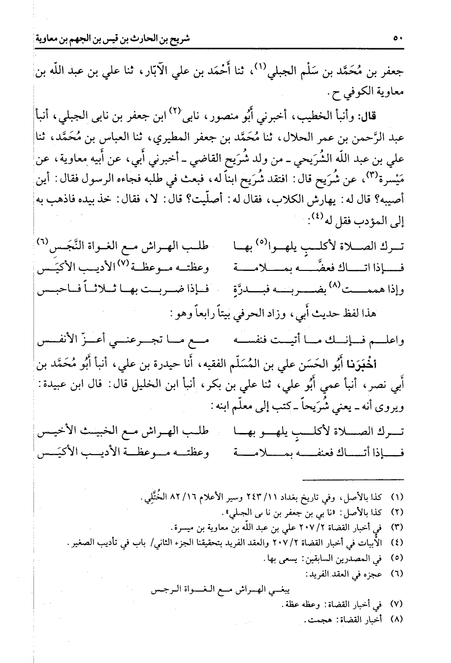 جعفر بن محمد بن سلم الجبلي (1) ثنا أحمد بن علي الآبار ثنا علي بن عبد الله بن معاوية الكوفي قال وأنبأ الخطيب أخبرني أبو منصور نابى (2) ابن جعفر بن نابى الجبلي أنبأ عبد الرحمن بن عمر الحلال ثنا محمد بن جعفر المطيري ثنا العباس بن محمد ثنا علي بن عبد الله الشريحي من ولد شريح القاضي أخبرني أبي عنأبيه معاوية عن ميسرة (3) عن شريح قال افتقد شريح ابنا له فبعث في طلبه فجاءه الرسول فقال أين أصيبه قال له يهارش الكلاب فقال له أصليت قال لا فقال خذ بيده فاذهب به إلى المؤدب فقل له (4) * ترك الصلاة لأكلب يلهوا (5) بها * طلب الهراش مع الغواة النجس * (6) * فإذا أتاك فعضه بملامة * وعظته موعظة (7) الأديب الأكيس وإذا هممت (8) بضربه فبدرة * فإذا ضربت بها ثلاثا فاحبس * هذا لفظ حديث أبي وزاد الحرفي بيتا رابعا وهو * واعلم فإنك ما أتيت فنفسه * مع ما تجرعني أعز الأنفس * أخبرنا أبو الحسن علي بن المسلم الفقيه أنا حيدرة بن علي أنبأ أبو محمد بن أبي نصر أنبأعمي أبو علي ثنا علي بن بكر أنبأ ابن الخليل قال قال ابن عبيدة ويروى أنه يعني شريحا كتب إلى معلم ابنه * ترك الصلاة لأكلب يلهو بها * طلب الهراش مع الخبيث الأخيس فإذا أتاك فعنفه بملامة * وعظته موعظة الأديب الأكيس