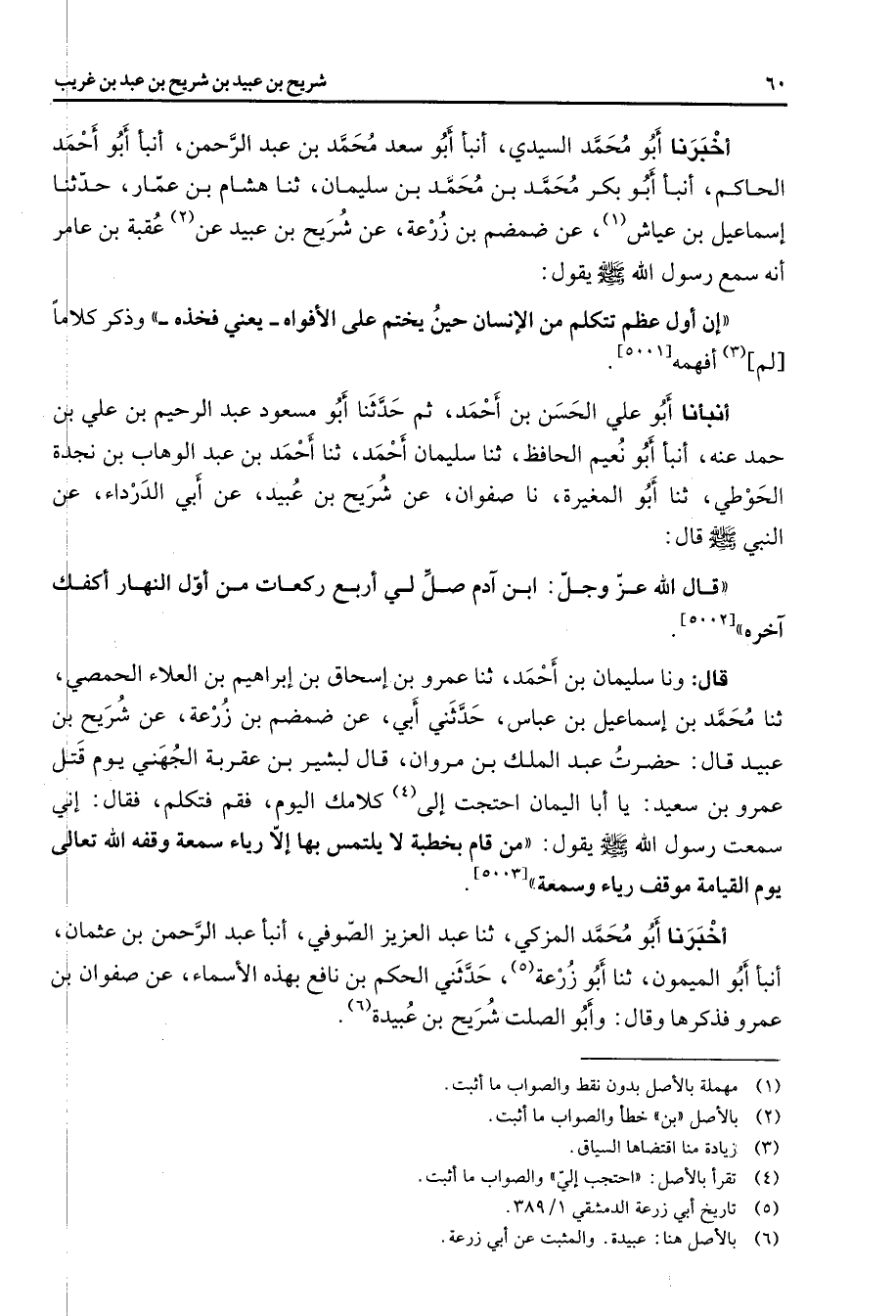 أخبرنا أبو محمد السيدي أنبأ أبو سعد محمد بن عبد الرحمن أنبأ أبو أحمد الحاكم أنبأ أبو بكر محمد بن محمد بن سليمان ثنا هشام بن عمار حدثنا إسماعيل بن عياش (1) عن ضمضم بن زرعة عن شريح بن عبيد عن (2) عقبة بن عامر أنه سمع رسول الله (صلى الله عليه وسلم) يقول إن أول عظم تتكلم من الأنسان حين يختم على الأفواه يعني فخذه وذكر كلاما لم (3) أفهمه أنبأنا أبو علي الحسن بن أحمد ثم حدثنا أبو مسعود عبد الرحيم بن علي بن حمد عنه أنبأ أبو نعيم الحافظ ثنا سليمان أحمد ثنا أحمد بن عبد الوهاب بن نجدة الحوطي ثنا أبو المغيرة نا صفوان عن شريح بن عبيد عن أبي الدرداء عن النبي (صلى الله عليه وسلم) قال قال الله عز وجل ابن آدم صل لي أربع ركعات من أول النهار أكفك آخره قال ونا سليمان بن أحمد ثنا عمرو بن إسحاق بن إبراهيم بن العلاء الحمصي ثنا محمد بن إسماعيل بن عباس حدثني أبي عن ضمضم بن زرعة عن شريح بن عبيد قال حضرت عبد الملك بن مروان قال لبشير بن عقربة الجهني يوم قتل عمرو بن سعيد يا أبا اليمان احتجت إلى كلامك اليوم فقم فتكلم فقال إني سمعت رسول الله (صلى الله عليه وسلم) يقول من قام بخطبة لا يلتمس بها إلا رياء سمعة وقفه الله تعالى يوم القيامة موقف رياء وسمعة أخبرنا أبو محمد المزكي ثنا عبد العزيز الصوفي أنبأ عبد الرحمن بن عثمان أنبأ أبو الميمون ثنا أبو زرعة (5) حدثني الحكم بن نافع بهذه الأسماء عن صفوان بن عمرو فذكرها وقال وأبو الصلت شريح بن عبيدة (6)