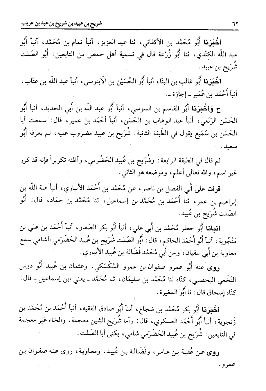 أخبرنا أبو محمد بن الأكفاني ثنا عبد العزيز أنبأ تمام بن محمد أنبأ أبو عبد الله الكندي ثنا أبو زرعة قال في تسمية أهل حمص من التابعين أبو الصلت شريح بن عبيد أخبرنا أبو غالب بن البنا أنبأ أبو الحسين بن الآبنوسي أنبأ عبد الله بن عتاب أنبأ أحمد بن عمير إجازة ح وأخبرنا أبو القاسم بن السوسي أنبأ أبو عبد الله بن أبي الحديد أنبأ أبو الحسن الربعي أنبأ عبد الوهاب بن الحسن أنبأ أحمد بن عمير قال سمعت أبا الحسن بن سميع يقول في الطبقة الثانية شريح بن عبيد مضروب عليه لم يعرفه أبو سعيد ثم قال في الطبقة الرابعة وشريح بن عبيد الحضرمي وأظنه تكريرا فإنه قد كرر غير اسم والله تعالى أعلم وموضعه هو الثاني قرأت على أبي الفضل بن ناصر عن محمد بن أحمد الأنباري أنبأ هبة الله بن إبراهيم بن عمر ثنا أحمد بن محمد بن إسماعيل ثنا محمد بن حماد قال أبو الصلت شريح بن عبيد أنبأنا أبو جعفر محمد بن أبي علي أنبأ أبو بكر الصفار أنبأ أحمد بن علي بن منجوية أنبأ أبو أحمد الحاكم قال أبو الصلت شريح بن عبيد الحضرمي الشامي سمع معاوية بن أبي سفيان وعن أبي محمد فضالة بن عبيد الأنباري روى عنه أبو عمرو صفوان بن عمرو السكسكي وعثمان بن عبيد أبو دوس النخعي اليحصبي كناه لنا محمد بن سليمان ثنا محمد يعني ابن إسماعيل قال كناه إسحاق قال نا أبو المغيرة أخبرنا أبو بكر محمد بن شجاع أنبأ أبو صادق الفقيه أنبأ أحمد بن محمد بن زنجوية أنبأ أبو أحمد العسكري قال وأما شريح الشين معجمة والخاء غير معجمة في التابعين شريح بن عبيد الحضرمي شامي يكنى أبا الصلت روى عن عقبة بن عامر وفضالة بن عبيد ومعاوية روى عنه صفوان بن عمرو