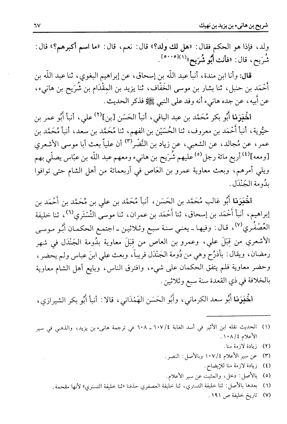 ولد فإذا هو الحكم فقال هل لك ولد قال نعم قال ما اسم أكبرهم قال شريح قال فأنت أبو شريح (1) [* *] قال وأنا ابن مندة أنبأ عبد الله بن إسحاق عن إبراهيم البغوي ثنا عبد الله بن أحمد بن حنبل ثنا بشار بن موسى الخفاف ثنا يزيد بن المقدام بن شريح بن هانئ عن أبيه عن جده هانئ أنه وفد على النبي (صلى الله عليه وسلم) فذكر الحديث أخبرنا أبو بكر محمد بن عبد الباقي أنبأ الحسن بن (2) علي أنبأ أبو عمر بن حيوية أنبأ أحمد بن معروف ثنا الحسين بن الفهم ثنا محمد بن سعد أنبأ محمد بن عمر عن مجالد عن الشعبي عن زياد بن النضر (3) أن عليا بعث أبا موسى الأشعري ومعه (4) أربع مائة رجل (5) عليهم شريح بن هانئ ومعهم عبد الله بن عباس يصلي بهم ويلي أمرهم وبعث معاوية عمرو بن العاص في أربعمائة من أهل الشام حتى توافوا بدومة الجندل أخبرنا أبو غالب محمد بن الحسن أنبأ محمد بن علي بن محمد بنأحمد بن إبراهيم أنبأ أحمد بن إسحاق ثنا أحمد بن عمران ثنا موسى التستري (6) ثنا خليفة العصفري (7) قال وفيها يعني سنة سبع وثلاثين اجتمع الحكمان أبو موسى الأشعري من قبل علي وعمرو بن العاص من قبل معاوية بدومة الجندل في شهر رمضان ويقال بأذرح وهي من دومة الجندل قريبا وبعث علي ابن عباس ولم يحضر وحضر معاوية فلم يتفق الحكمان على شئ وافترق الناس وبايع أهل الشام معاوية بالخلافة في ذي القعدة سنة سبع وثلاثين أخبرنا أبو سعد الكرماني وأبو الحسن الهمداني قالا أنبأ أبو بكر الشيرازي