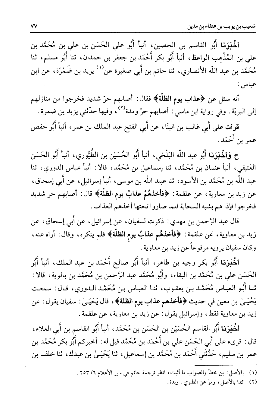 أخبرنا أبو القاسم بن الحصين أنبأ أبو علي الحسن بن علي بن محمد بن علي بن المذهب الواعظ أنبأ أبو بكر أحمد بن جعفر بن حمدان ثنا أبو مسلم ثنا محمد بن عبد الله الأنصاري ثنا حاتم بن أبي صغيرة عن (1) يزيد بن ضمرة عن ابن عباس أنه سئل عن " عذاب يوم الظلة " فقال أصابهم حر شديد فخرجوا من منازلهم إلى البرية وفي رواية ابن ماسي أصابهم حر ومدة (2) وفيها حدثني يزيد بن ضمرة قرأت على أبي غالب بن البنا عن أبي الفتح عبد الملك بن عمر أنبأ أبو حفص عمر بن أحمد ح وأخبرنا أبو عبد الله البلخي أنبأ أبو الحسين بن الطيوري أنبأ أبو الحسن العتيقي أنبأ عثمان بن محمد ثنا إسماعيل بن محمد قالا أنبأ عباس الدوري ثنا عبد الله بن محمد بن الأسود ثنا عبيد الله بن موسى أنبأ إسرائيل عن أبي إسحاق عن زيد بن معاوية عن علقمة " فأخذهم عذاب يوم الظلة " قال أصابهم حر شديد فخرجوا فإذا هم بشبه السحابة فلما صاروا تحتها أخذهم العذاب قال عبد الرحمن بن مهدي ذكرت لسفيان عن إسرائيل عن أبي إسحاق عن زيد بن معاوية عن علقمة " فأخذهم عذاب يوم الظلة " فلم ينكره وقال أراه عنه وكان سفيان يرويه مرفوعا عن زيد بن معاوية أخبرنا أبو بكر وجيه بن طاهر أنبأ أبو صالح أحمد بن عبد الملك أنبأ أبو الحسن علي بن محمد بن البقاء وأبو محمد عبد الرحمن بن محمد بن بالوية قالا ثنا أبو العباس محمد بن يعقوب ثنا العباس بن محمد الدوري قال سمعت يحيى بن معين في حديث " فأخذهم عذاب يوم الظلة " قال يحيى سفيان يقول عن زيد بن معاوية فقط وإسرائيل يقول عن زيد بن معاوية عن علقمة أخبرنا أبو القاسم الحسين بن الحسن بن محمد أنبأ أبو القاسم بن أبي العلاء قال قرئ على أبي الحسن علي بن أحمد بن محمد قيل له أخبركم أبو بكر محمد بن عمر بن سليم حدثني أحمد بن محمد بن إسماعيل ثنا يحيى بن عبدك ثنا خلف بن