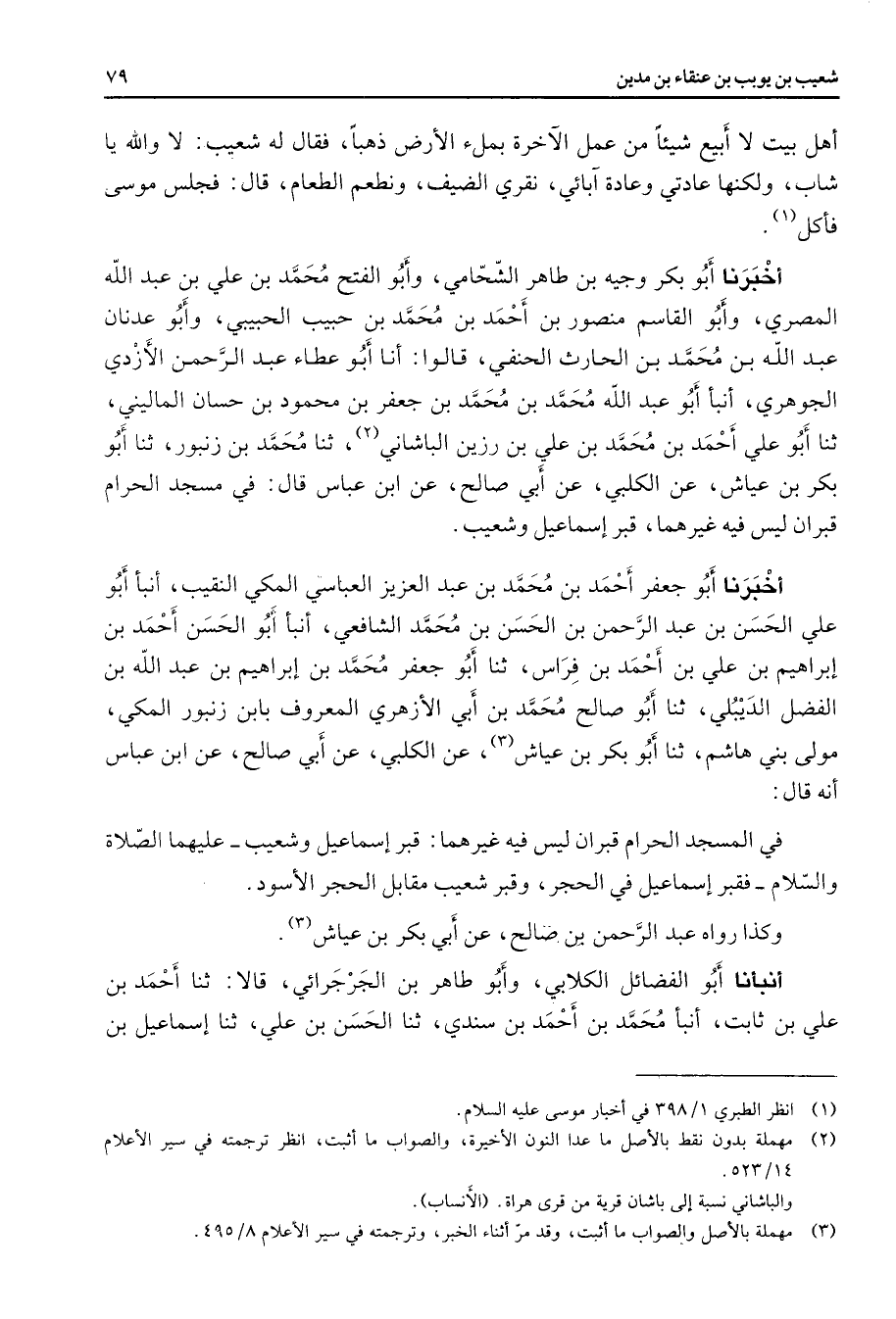 أهل بيت لا أبيع شيئا من عمل الآخرة بملء الأرض ذهبا فقال له شعيب لا والله يا شاب ولكنها عادتي وعادة آبائي نقري الضيف ونطعم الطعام قال فجلس موسى فأكل (1) أخبرنا أبو بكر وجيه بن طاهر الشحامي وأبو الفتح محمد بن علي بن عبد الله المصري وأبو القاسم منصور بن أحمد بن محمد بن حبيب الحبيبي وأبو عدنان عبد الله بن محمد بن الحارث الحنفي قالوا أنا أبو عطاء عبد الرحمن الأزدي الجوهري أنبأ أبو عبد الله محمد بن محمد بن جعفر بن محمود بن حسان الماليني ثنا أبو علي أحمد بن محمد بن علي بن رزين الباشاني (2) ثنا محمد بن زنبور ثنا أبو بكر بن عياش عن الكلبي عن أبي صالح عن ابن عباس قال في مسجد الحرام قبران ليس فيه غيرهما قبر إسماعيل وشعيب أخبرنا أبو جعفر أحمد بن محمد بن عبد العزيز العباسي المكي النقيب أنبأ أبو علي الحسن بن عبد الرحمن بن الحسن بن محمد الشافعي أنبأ أبو الحسن أحمد بن إبراهيم بن علي بن أحمد بن فراس ثنا أبو جعفر محمد بن إبراهيم بن عبد الله بن الفضل الديبلي ثنا أبو صالح محمد بن أبي الأزهري المعروف بابن زنبور المكي مولى بني هاشم ثنا أبو بكر بن عياش (3) عن الكلبي عن أبي صالح عن ابن عباس أنه قال في المسجد الحرام قبران ليس فيه غيرهما قبر إسماعيل وشعيب عليهما الصلاة والسلام فقبر إسماعيل في الحجر وقبر شعيب مقابل الحجر الأسود وكذا رواه عبد الرحمن بن صالح عن أبي بكر بن عياش أنبأنا أبو الفضائل الكلابي وأبو طاهر بن الجرجرائي قالا ثنا أحمد بن علي بن ثابت أنبأ محمد بنأحمد بن سندي ثنا الحسن بن علي ثنا إسماعيل بن