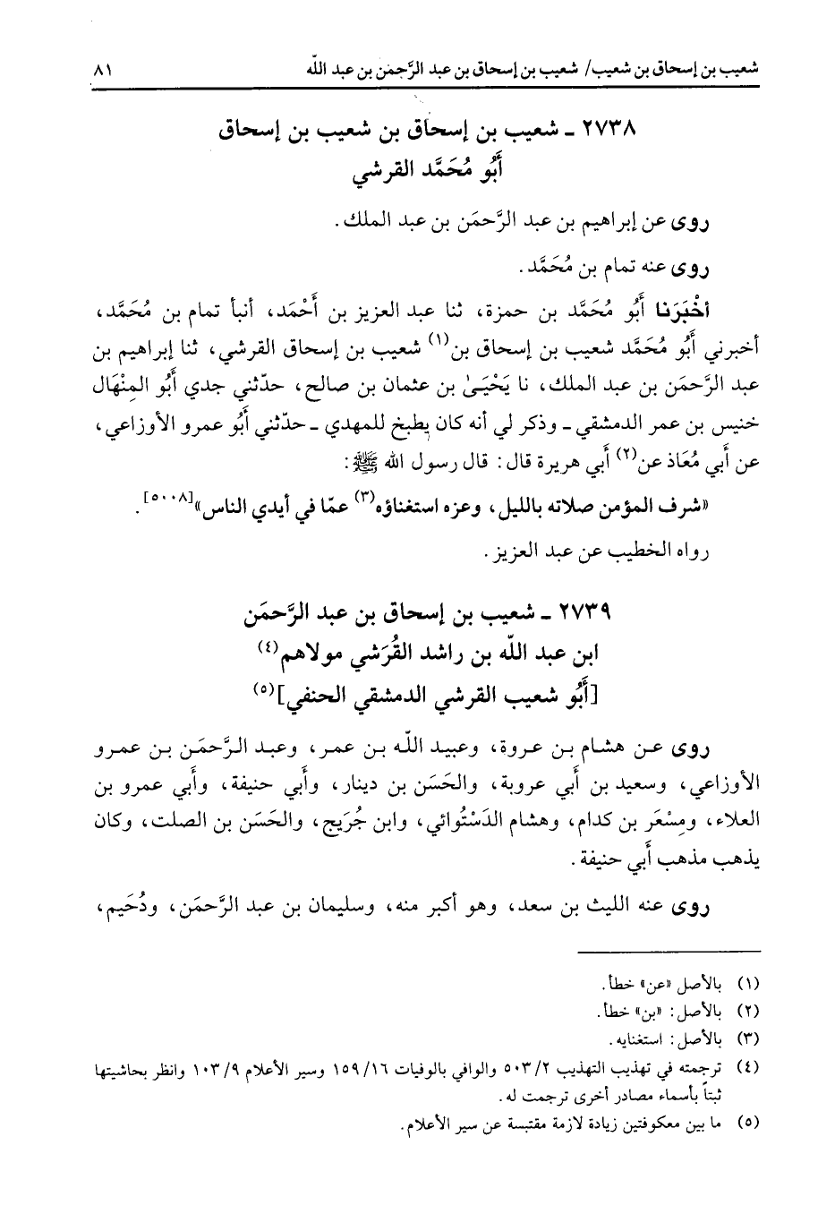 2738 - شعيب بن إسحاق بن شعيب بن إسحاق أبو محمد القرشي روى عن إبراهيم بن عبد الرحمن بن عبد الملك روى عنه تمام بن محمد أخبرنا أبو محمد بن حمزة ثنا عبد العزيز بنأحمد أنبأتمام بن محمد أخبرني أبو محمد شعيب بن إسحاق بن (1) شعيب بن إسحاق القرشي ثنا إبراهيم بن عبد الرحمن بن عبد الملك نا يحيى بن عثمان بن صالح حدثني جدي أبو المنهال خنيس بن عمر الدمشقي وذكر لي أنه كان يطبخ للمهدي حدثني أبو عمرو الأوزاعي عن أبي معاذ عن (2) أبي هريرة قال قال رسول الله (صلى الله عليه وسلم) شرف المؤمن صلاته بالليل وعزه استغناؤه (3) عما في أيدي الناس رواه الخطيب عن عبد العزيز