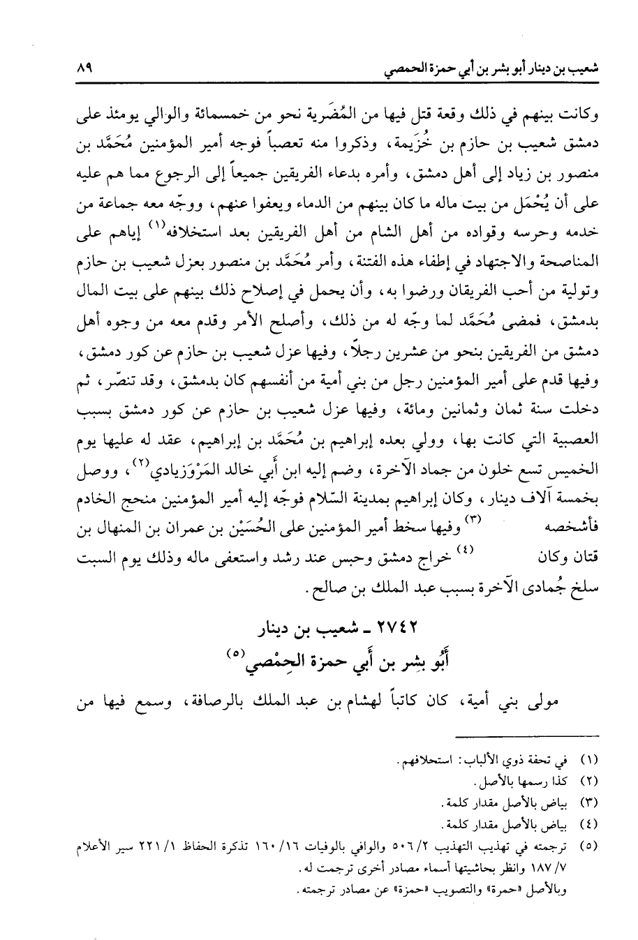 2742 - شعيب بن دينار أبو بشر بن أبي حمزة الحمصي (5) مولى بني أمية كان كاتبا لهشام بن عبد الملك بالرصافة وسمع فيها من