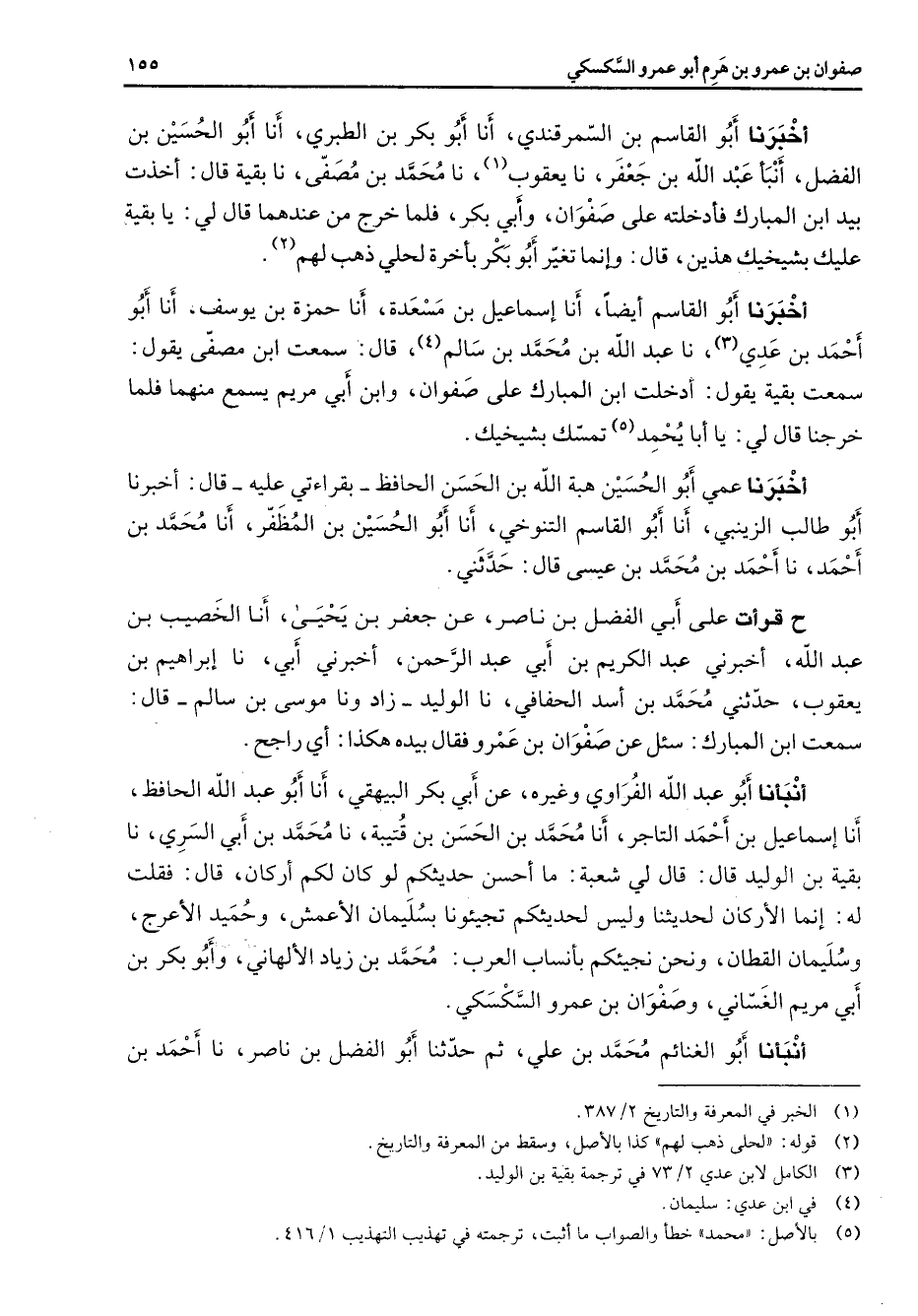 أخبرنا أبو القاسم أيضا أنا إسماعيل بن مسعدة أنا حمزة بن يوسف أنا أبو أحمد بن عدي (3) نا عبد الله بن محمد بن سالم (4) قال سمعت ابن مصفى يقول سمعت بقية يقول أدخلت ابن المبارك على صفوان وابن أبي مريم يسمع منهما فلما خرجنا قال لي يا أبا يحمد (5) تمسك بشيخيك أخبرنا عمي أبو الحسين هبة الله بن الحسن الحافظ بقراءتي عليه قال أخبرنا أبو طالب الزينبي أنا أبو القاسم التنوخي أنا أبو الحسين بن المظفر أنا محمد بن أحمد نا أحمد بن محمد بن عيسى قال حدثني ح قرأت على أبي الفضل بن ناصر عن جعفر بن يحيى أنا الخصيب بن عبد الله أخبرني عبد الكريم بن أبي عبد الرحمن أخبرني أبي نا إبراهيم بن يعقوب حدثني محمد بن أسد الحفافي نا الوليد زاد ونا موسى بن سالم قال سمعت ابن المبارك سئل عن صفوان بن عمرو فقال بيده هكذا أي راجح أنبأنا أبو عبد الله الفراوي وغيره عن أبي بكر البيهقي أنا أبو عبد الله الحافظ أنا إسماعيل بن أحمد التاجر أنا محمد بن الحسن بن قتيبة نا محمد بن أبي السري نا بقية بن الوليد قال قال لي شعبة ما أحسن حديثكم لو كان لكم أركان قال فقلت له إنما الأركان لحديثنا وليس لحديثكم تجيئونا بسليمان الأعمش وحميد الأعرج وسليمان القطان ونحن نجيئكم بأنساب العرب محمد بن زياد الألهاني وأبو بكر بن أبي مريم الغساني وصفوان بن عمرو السكسكي أنبأنا أبو الغنائم محمد بن علي ثم حدثنا أبو الفضل بن ناصر نا أحمد بن