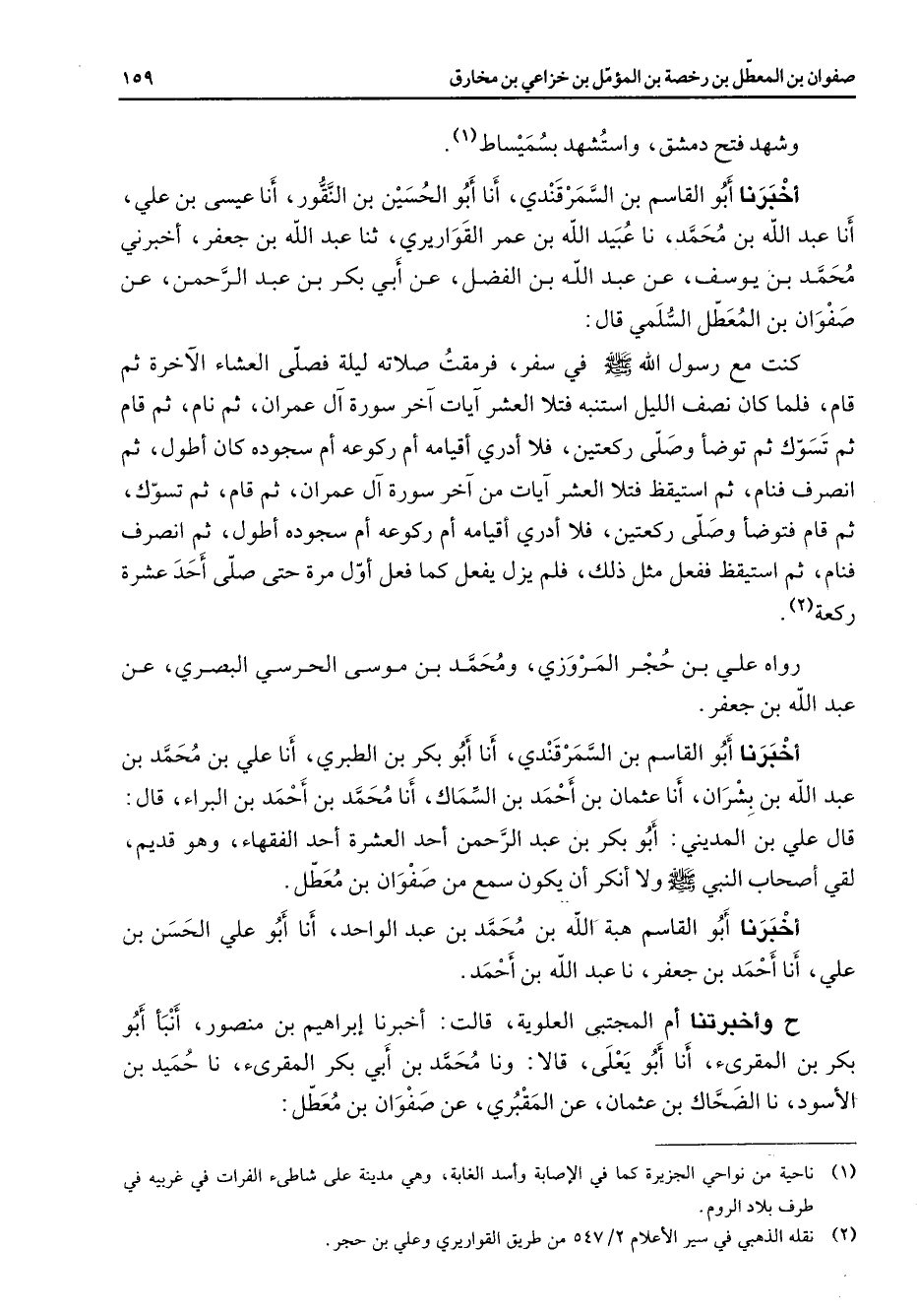 أخبرنا أبو القاسم بن السمرقندي أنا أبو الحسين بن النقور أنا عيسى بن علي أنا عبد الله بن محمد نا عبيد الله بن عمر القواريري ثنا عبد الله بن جعفر أخبرني محمد بن يوسف عن عبد الله بن الفضل عن أبي بكر بن عبد الرحمن عن صفوان بن المعطل السلمي قال كنت مع رسول الله (صلى الله عليه وسلم) في سفر فرمقت صلاته ليلة فصلى العشاء الآخرة ثم قام فلما كان نصف الليل استنبه فتلا العشر آيات آخر سورة آل عمران ثم نام ثم قام ثم تسوك ثم توضأ وصلى ركعتين فلا أدري أقيامه أم ركوعه أم سجوده كان أطول ثم انصرف فنام ثم استيقظ فتلا العشر آيات من آخر سورة آل عمران ثم قام ثم تسوك ثم قام فتوضأ وصلى ركعتين فلا أدري أقيامه أم ركوعه أم سجوده أطول ثم انصرف فنام ثم استيقظ ففعل مثل ذلك فلم يزل يفعل كما فعل أول مرة حتى صلى أحد عشرة ركعة (2)