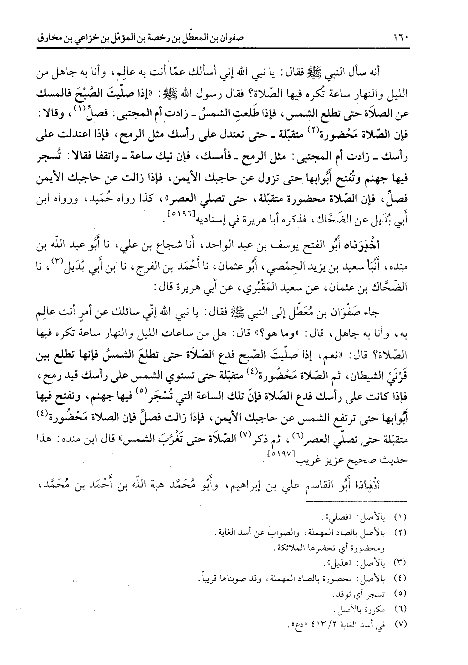 أنه سأل النبي (صلى الله عليه وسلم) فقال يا نبي الله إني أسألك عما أنت به عالم وأنا به جاهل من الليل والنهار ساعة تكره فيها الصلاة فقال رسول الله (صلى الله عليه وسلم) إذا صليت الصبح فالمسك عن الصلاة حتى تطلع الشمس فإذا طلعت الشمس زادت أم المجتبى فصل (1) وقالا فإن الصلاة محضورة (2) متقبلة حتى تعتدل على رأسك مثل الرمح فإذا اعتدلت على رأسك زادت أم المجتبى مثل الرمح فأمسك فإن تيك ساعة واتفقا فقالا تسجر فيها جهنم وتفتح أبوابها حتى تزول عن حاجبك الأيمن فإذا زالت عن حاجبك الأيمن فصل فإن الصلاة محضورة متقبلة حتى تصلي العصر كذا رواه حميد ورواه ابن أبي بديل عن الضحاك فذكره أبا هريرة في إسناديه أخبرناه أبو الفتح يوسف بن عبد الواحد أنا شجاع بن علي نا أبو عبد الله بن منده أنبأ سعيد بن يزيد الحمصي أبو عثمان نا أحمد بن الفرج نا ابن أبي بديل (3) نا الضحاك بن عثمان عن سعيد المقبري عن أبي هريرة قال جاء صفوان بن معطل إلى النبي (صلى الله عليه وسلم) فقال يا نبي الله إني سائلك عن أمر أنت عالم به وأنا به جاهل قال وما هو قال هل من ساعات الليل والنهار ساعة تكره فيها الصلاة قال نعم إذا صليت الصبح فدع الصلاة حتى تطلع الشمس فإنها تطلع بين قرني الشيطان ثم الصلاة محضورة (4) متقبلة حتى تستوي الشمس على رأسك قيد رمح فإذا كانت على رأسك فدع الصلاة فإن تلك الساعة التي تسجر (5) فيها جهنم وتفتح فيها أبوابها حتى ترتفع الشمس عن حاجبك الأيمن فإذا زالت فصل فإن الصلاة محضورة (4) متقبلة حتى تصلي العصر (6) ثم ذكر (7) الصلاة حتى تغرب الشمس قال ابن منده هذا حديث صحيح عزيز غريب أنبأنا أبو القاسم علي بن إبراهيم وأبو محمد هبة الله بن أحمد بن محمد