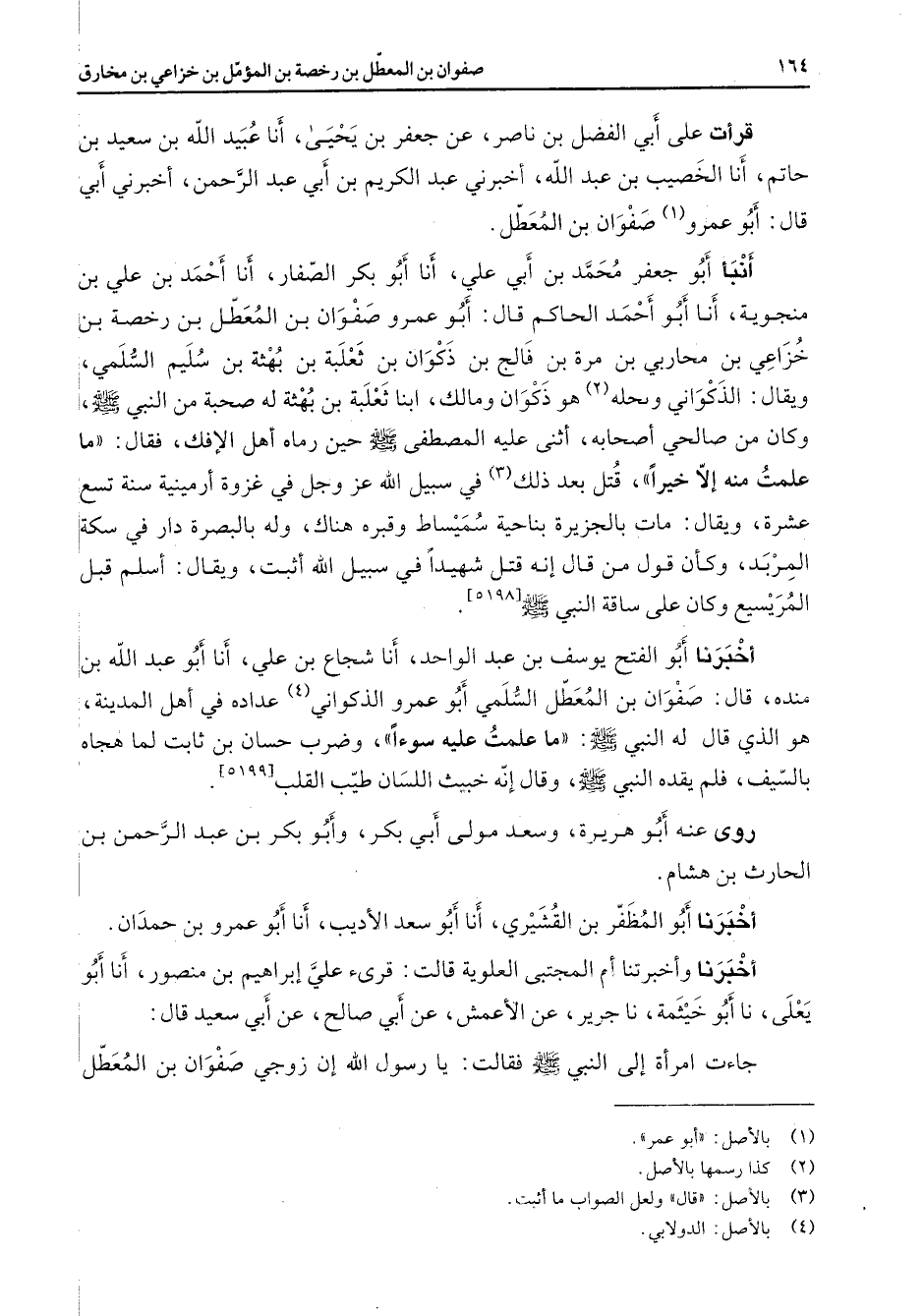 قرأت على أبي الفضل بن ناصر عن جعفر بن يحيى أنا عبيد الله بن سعيد بن حاتم أنا الخصيب بن عبد الله أخبرني عبد الكريم بن أبي عبد الرحمن أخبرني أبي قال أبو عمرو (1) صفوان بن المعطل أنبأ أبو جعفر محمد بن أبي علي أنا أبو بكر الصفار أنا أحمد بن علي بن منجوية أنا أبو أحمد الحاكم قال أبو عمرو صفوان بن المعطل بن رخصة بن خزاعي بن محاربي بن مرة بن فالج بن ذكوان بن ثعلبة بن بهثة بن سليم السلمي ويقال الذكواني ونحله (2) هو ذكوان ومالك ابنا ثعلبة بن بهثة له صحبة من النبي (صلى الله عليه وسلم) وكان من صالحي أصحابه أثنى عليه المصطفى (صلى الله عليه وسلم) حين رماه أهل الإفك فقال ما علمت منه إلا خيرا قتل بعد ذلك (3) في سبيل الله عز وجل في غزوة أرمينية سنة تسع عشرة ويقال مات بالجزيرة بناحية سميساط وقبره هناك وله بالبصرة دار في سكة المربد وكأن قول من قال إنه قتل شهيدا في سبيل الله أثبت ويقال أسلم قبل المريسيع وكان على ساقة النبي (صلى الله عليه وسلم) أخبرنا أبو الفتح يوسف بن عبد الواحد أنا شجاع بن علي أنا أبو عبد الله بن منده قال صفوان بن المعطل السلمي أبو عمرو الذكواني (4) عداده في أهل المدينة هو الذي قال له النبي (صلى الله عليه وسلم) ما علمت عليه سوءا وضرب حسان بن ثابت لما هجاه بالسيف فلم يقده النبي (صلى الله عليه وسلم) وقال إنه خبيث اللسان طيب القلب روى عنه أبو هريرة وسعد مولى أبي بكر وأبو بكر بن عبد الرحمن بن الحارث بن هشام أخبرنا أبو المظفر بن القشيري أنا أبو سعد الأديب أنا أبو عمرو بن حمدان أخبرنا وأخبرتنا أو المجتبى العلوية قالت قرئ علي إبراهيم بن منصور أنا أبو يعلى نا أبو خيثمة نا جرير عن الأعمش عن أبي صالح عن أبي سعيد قال جاءت امرأة إلى النبي (صلى الله عليه وسلم) فقالت يا رسول الله إن زوجي صفوان بن المعطل