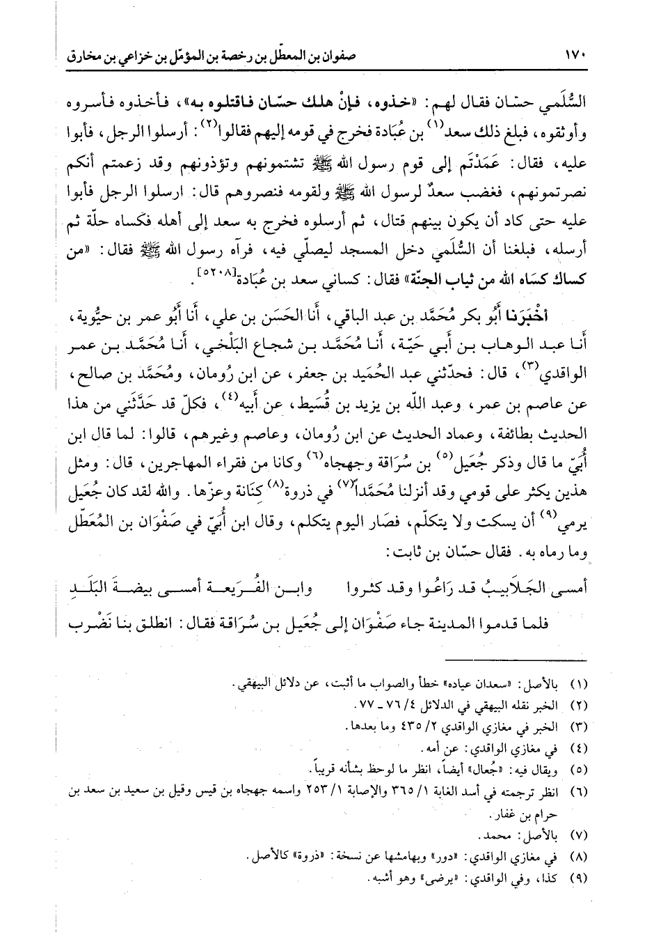 السلمي حسان فقال لهم خذوه فإن هلك حسان فاقتلوه به فأخذوه فأسروه وأوثقوه فبلغ ذلك سعد (1) بن عبادة فخرج في قومه إليهم فقالوا (2) أرسلوا الرجل فأبوا عليه فقال عمدتم إلى قوم رسول الله (صلى الله عليه وسلم) تشتمونهم وتؤذونهم وقد زعمتم أنكم نصرتمونهم فغضب سعد لرسول الله (صلى الله عليه وسلم) ولقومه فنصروهم قال أرسلوا الرجل فأبوا عليه حتى كاد أن يكون بينهم قتال ثم أرسلوه فخرج به سعد إلى أهله فكساه حلة ثم أرسله فبلغنا أن السلمي دخل المسجد ليصلي فيه فرآه رسول الله (صلى الله عليه وسلم) فقال من كساك كساه الله من ثياب الجنة فقال كساني سعد بن عبادة أخبرنا أبو بكر محمد بن عبد الباقي أنا الحسن بن علي أنا أبو عمر بن حيوية أنا عبد الوهاب بن أبي حية أنا محمد بن شجاع البلخي أنا محمد بن عمر الواقدي (3) قال فحدثني عبد الحميد بن جعفر عن ابن رومان ومحمد بن صالح عن عاصم بن عمر وعبد الله بن يزيد بن قسيط عن أبيه (4) فكل قد حدثني من هذا الحديث بطائفة وعماد الحديث عن ابن رومان وعاصم وغيرهم قالوا لما قال ابن أبي ما قال وذكر جعيل (5) بن سراقة وجهجاه (6) وكانا من فقراء المهاجرين قال ومثل هذين يكثر على قومي وقد أنزلنا محمدا (7) في ذروة (8) كنانة وعزها والله لقد كان جعبل يرمي (9) أن يسكت ولا يتكلم فصار اليوم يتكلم وقال ابن أبي في صفوان بن المعطل وما رماه به فقال حسان بن ثابت * أمسى الجلابيب قد راعوا وقد كثروا * وابن الفريعة أمسى بيضة البلد * فلما قدموا المدينة جاء صفوان إلى جعيل بن سراقة فقال انطلق بنا نضرب